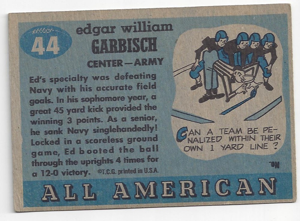 Edgar Garbischt 1955 Topps All American Football Card #44 Army. This card is in VG/EX condition. The corners are a soft. Colors strong. There some loss of white boarder on lef side. Powered by eBay Turbo Lister The * listing tool. List your items fast and easy and manage your active items.