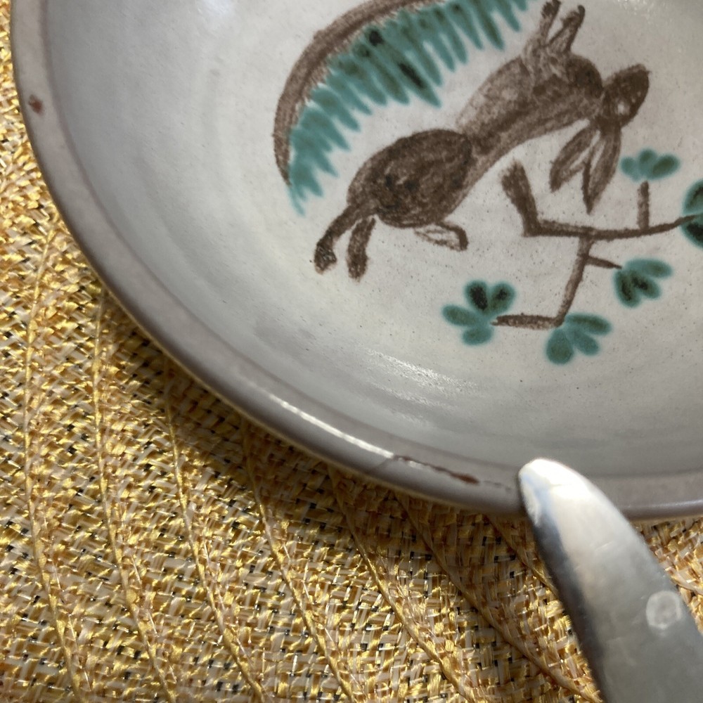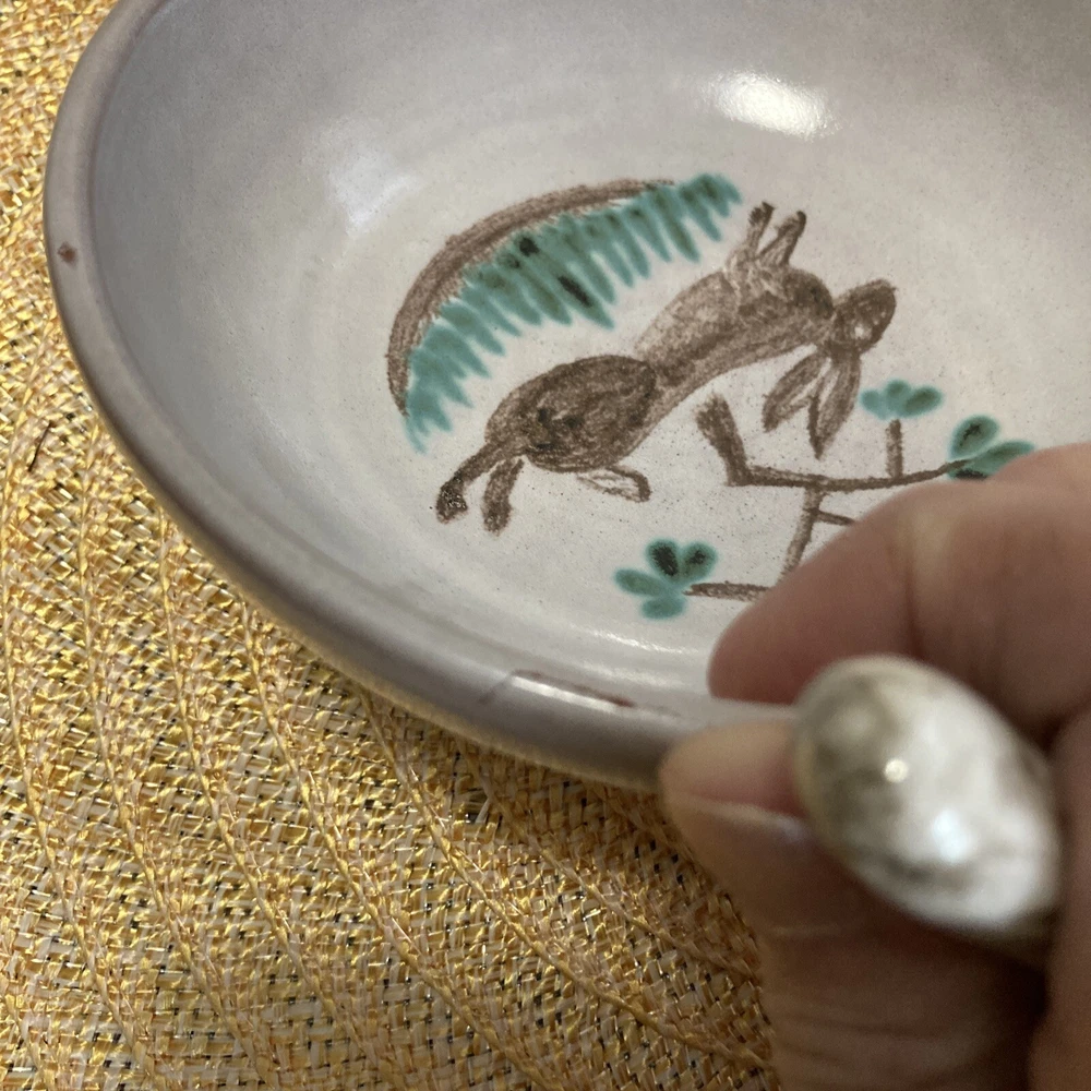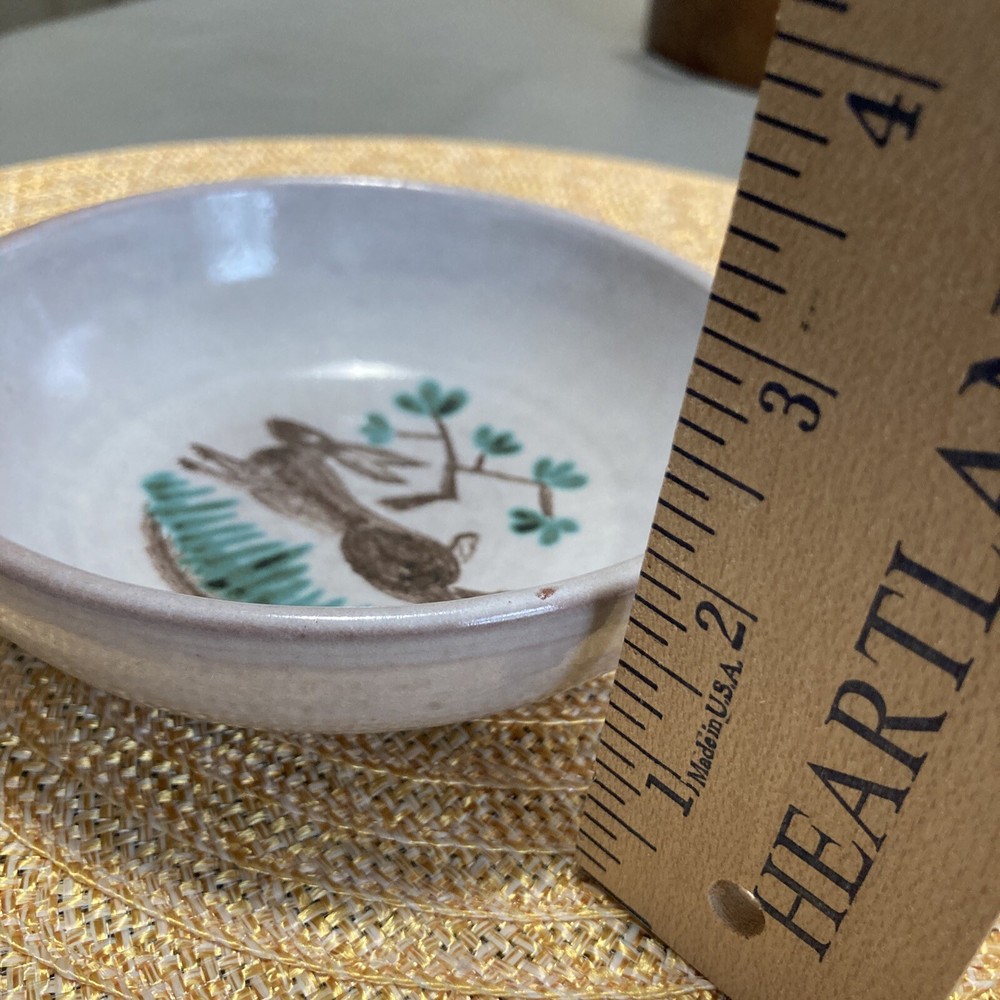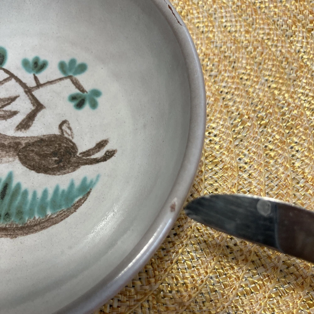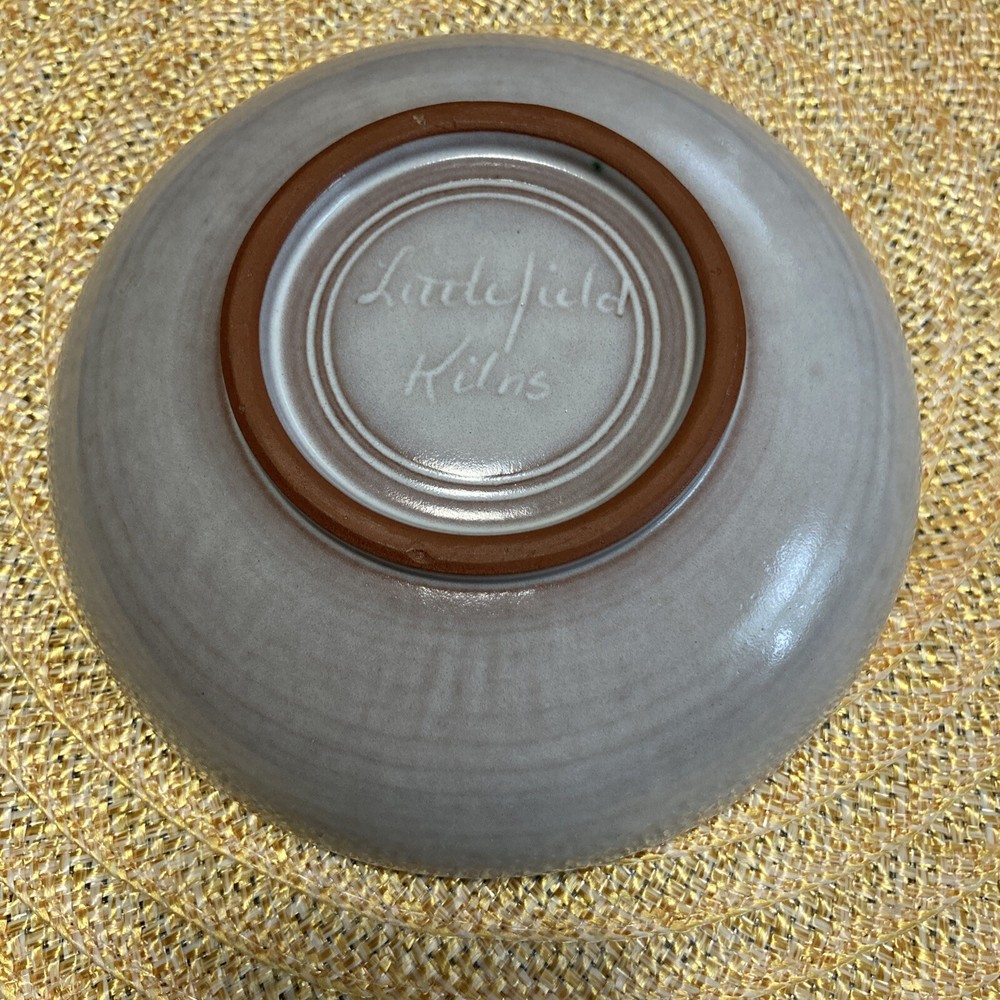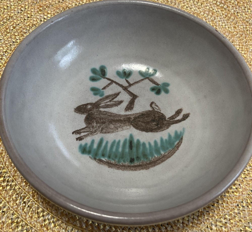 Early Edgar Littlefield bowl approximately 1940-1970 individual bowl I have pointed out minor crack and paint chips see photos jumping brown bunny over grass on grey bowl signed littlefield kilns approximately 5x2 Edgar Littlefield BIOGRAPHY Edgar Littlefield is known for high-fired stoneware pottery surfaced with geometric patterns and animal imagery, as well as solid colors. Littlefield was a graduate student at Ohio State University in the 1920’s and began working as a professor there in 1929. Potter Arthur E. Baggs, was one of Littlefield’s professors at Ohio State University. When Littlefield joined the faculty Baggs became his mentor. Littlefield’s pottery has the distinction of winning two First Prizes in the Robineau Memorial Ceramic Exhibitions, Syracuse Museum of Fine Art (now the Everson Museum), Syracuse, New York.