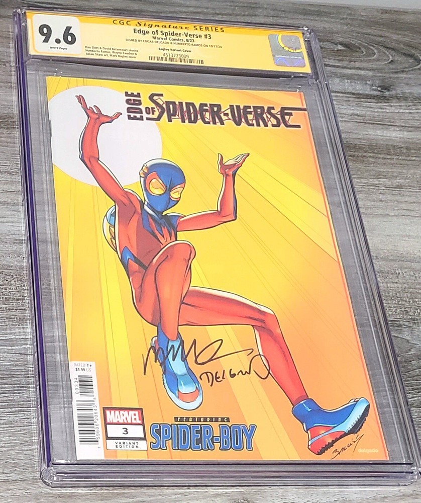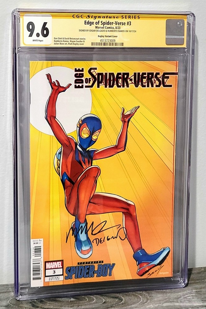 The comic book "Edge of Spider-Verse 3" features a rare 1:200 incentive variant with a cover signed by both artist Humberto Ramos and colorist Edgar Delgado. Published by Marvel Comics in 2023 as part of the Marvel Universe, this single issue is professionally graded at 9.6 Near Mint+ by Certified Guaranty Company (CGC). The comic belongs to the Modern Age era and is in English, tailored for a general audience of superhero fans. With a unique artist cover and both creators' signatures, this collectible piece is a standout addition for comic book enthusiasts.