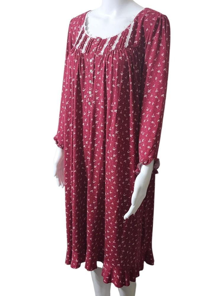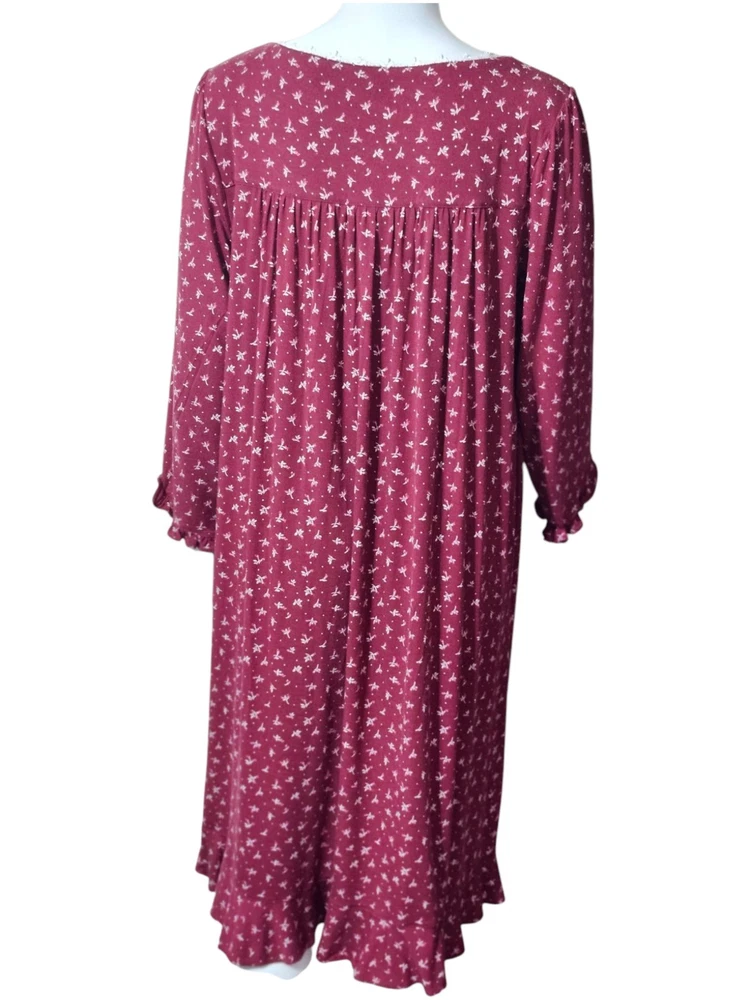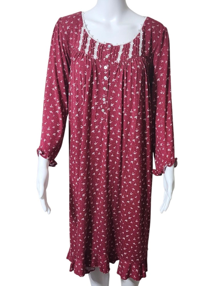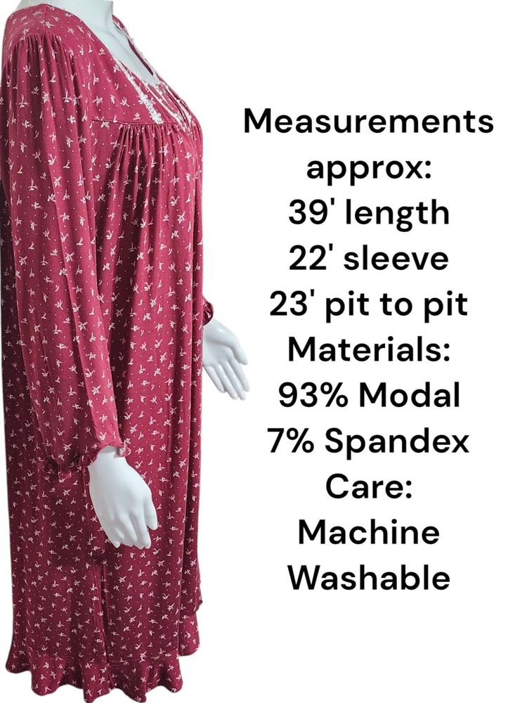 Absolutely love this nightgown! The red floral print is so pretty, and the soft lace trim adds a luxurious touch. It's incredibly comfortable, with a cozy fit and cute ruffle details. The buttons are sturdy, and it arrived in excellent pre-owned condition as described. Perfect for a relaxed, feminine sleep—super happy with this purchase! Shipping was quick too.