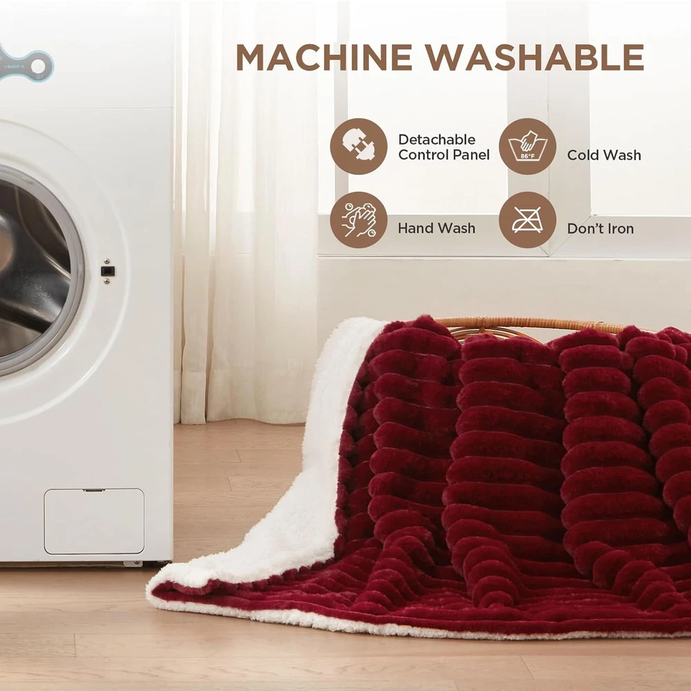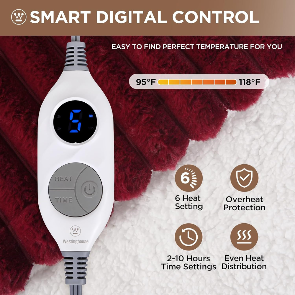 【LUXURIOUS MATERIALS KEEP YOU WARM】 Westinghouse heated throw blanket is made of 350GSM luxury faux fur to 180GSM white sherpa, we pay great attention to product workmanship and quality, which is super soft, comfortable, skin-friendly and breathable, healthy, and can be directly in contact with the skin. The inner heating line is evenly distributed to avoid local overheating, allowing you to use it with peace of mind 【ETL & FCC CERTIFIED】 Westinghouse electric blanket throw has overheat protection that can be ensured your safety during normal use. ETL and FCC certified heated blanket throw with low electromagnetic radiation. Please read the instructions carefully before use to avoid local overheating caused by improper use 【INTELLIGENT SINGLE CONTROL & OVERHEATING PROTECTION】 Our electric throw blanket supports 20-minute warm-up, help to quickly start the heating process, so you don't have to wait too long to lie under a warm quilt. 10-hour automatic shutdown, overheating protection and other functions, let you use it more confidently. 6 heating settings, the temperature can be adjusted freely. The length of the power cord is 72 + 32 inches 【APPLICATION & SCENES】 Westinghouse heated throw blanket electric is suitable for single use, watching television, reading books, relaxing at home on couch or sofa, during work on office, bring you a warm and comfortable life experience 【BEST GIFT SELECTION】 If you have family and friends who are afraid of the cold, this is the best winter gift you can give him. The heating throw blanket is the best gift option as a bed warmer and the best safe choice 【EASY TO CARE & MACHINE WASH】Our heating blanket throw supports machine washing, you need to unplug the power cord from the controller before cleaning, and put it in the washing machine at 30°C water temperature. NOTE: DO NOT DRY CLEAN. DO NOT BLEACH. DO NOT IRON. DO NOT PLUG IN AND TURN ON THE HEATING PRODUCT WHEN WET. DO NOT USE UNTIL COMPLETELY DRY 【WARRANTY】 Westinghouse electric blankets come with a warranty, so if you have any questions or concerns about your product, please contact our customer service for assistance. Product Description