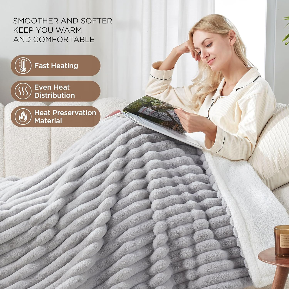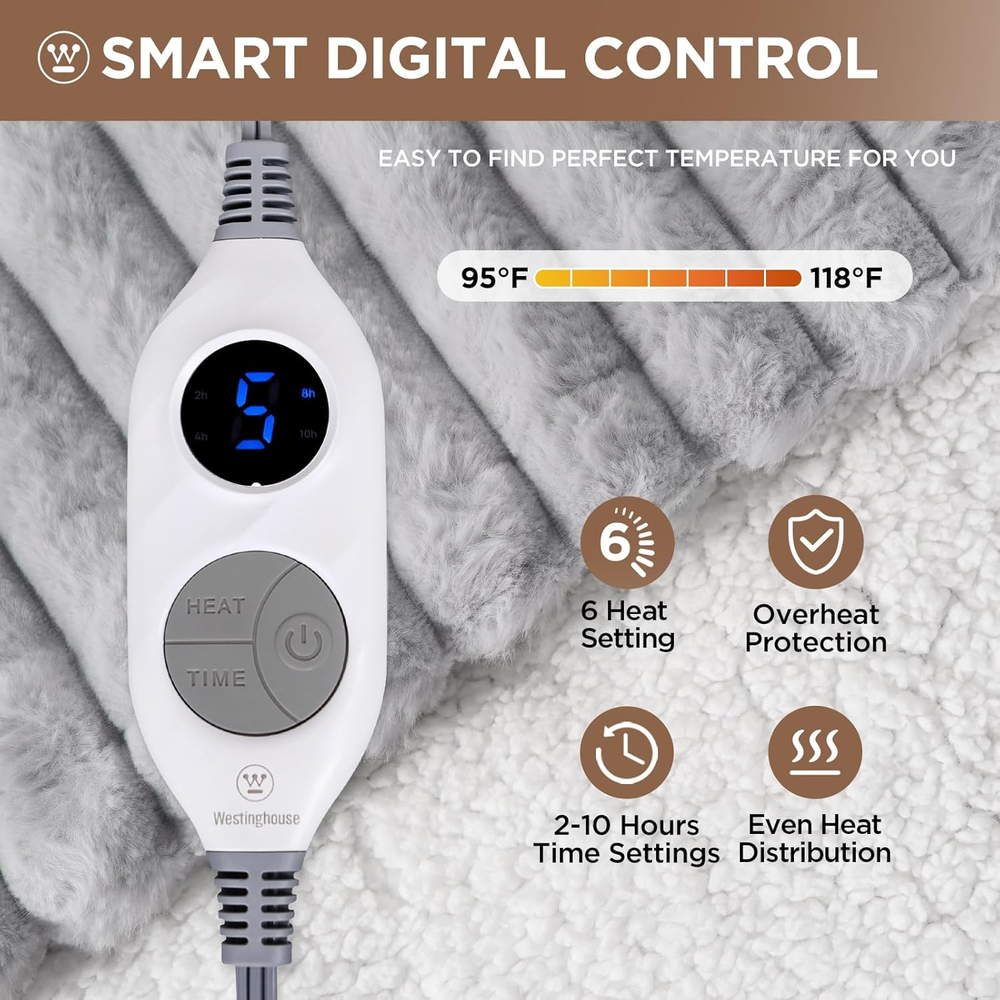 【LUXURIOUS MATERIALS KEEP YOU WARM】 Westinghouse heated throw blanket is made of 350GSM luxury faux fur to 180GSM white sherpa, we pay great attention to product workmanship and quality, which is super soft, comfortable, skin-friendly and breathable, healthy, and can be directly in contact with the skin. The inner heating line is evenly distributed to avoid local overheating, allowing you to use it with peace of mind 【ETL & FCC CERTIFIED】 Westinghouse electric blanket throw has overheat protection that can be ensured your safety during normal use. ETL and FCC certified heated blanket throw with low electromagnetic radiation. Please read the instructions carefully before use to avoid local overheating caused by improper use 【INTELLIGENT SINGLE CONTROL & OVERHEATING PROTECTION】 Our electric throw blanket supports 20-minute warm-up, help to quickly start the heating process, so you don't have to wait too long to lie under a warm quilt. 10-hour automatic shutdown, overheating protection and other functions, let you use it more confidently. 6 heating settings, the temperature can be adjusted freely. The length of the power cord is 72 + 32 inches 【APPLICATION & SCENES】 Westinghouse heated throw blanket electric is suitable for single use, watching television, reading books, relaxing at home on couch or sofa, during work on office, bring you a warm and comfortable life experience 【BEST GIFT SELECTION】 If you have family and friends who are afraid of the cold, this is the best winter gift you can give him. The heating throw blanket is the best gift option as a bed warmer and the best safe choice 【EASY TO CARE & MACHINE WASH】Our heating blanket throw supports machine washing, you need to unplug the power cord from the controller before cleaning, and put it in the washing machine at 30°C water temperature. NOTE: DO NOT DRY CLEAN. DO NOT BLEACH. DO NOT IRON. DO NOT PLUG IN AND TURN ON THE HEATING PRODUCT WHEN WET. DO NOT USE UNTIL COMPLETELY DRY 【WARRANTY】 Westinghouse electric blankets come with a warranty, so if you have any questions or concerns about your product, please contact our customer service for assistance. Product Description