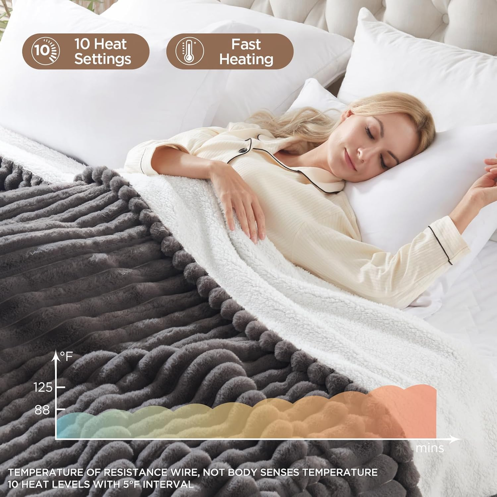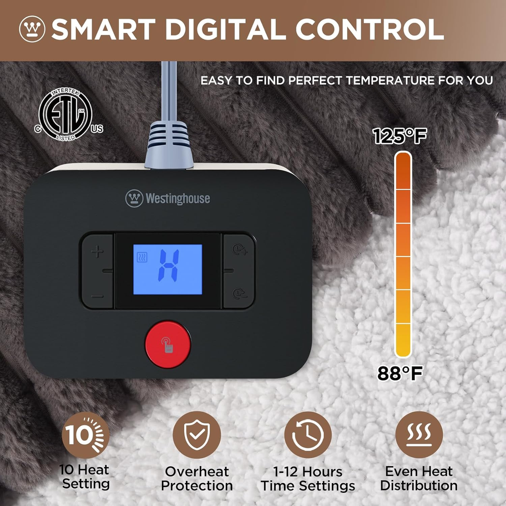 Store New Arrivals Add to Favorite View Feedback Contact Electric Blanket Twin Size, Super Cozy Luxury Faux Fur & Sherpa Heated Blanket with 10 Heating Levels & 1-12 Hours Auto Off, Fast Heating Blanket, Machine Washable, 62X 84 Inch Charcoal Description Item model number 1 Style Home Number of Items 1 Pattern Solid Country of Origin China Blanket Form Throw Blanket Theme Warm Unit Count 1.0 Count Product Dimensions 12.6"L x 12.6"W Material Luxurious Faux Fur to Sherpa Model Name 1 Seasons Winter, Fall Age Range (Description) Adult Item Weight 7.5 pounds Special Feature Breathable Fabric Warmth Description Heavyweight Color Charcoal Recommended Uses For Product Home Sport 1 Fabric Type Faux Fur Product Care Instructions Machine Wash Size Twin Size 62"x84" 【LUXURIOUS MATERIALS KEEP YOU WARM】 Westinghouse electric heating blanket is made of 350GSM luxury faux fur to 180GSM white sherpa, we pay great attention to product workmanship and quality, which is super soft, comfortable, skin-friendly and breathable, healthy, and can be directly in contact with the skin. The inner heating line is evenly distributed to avoid local overheating, allowing you to use it with peace of mind 【ETL & FCC CERTIFIED】 Westinghouse heated blanket has overheat protection that can be ensured your safety during normal use. ETL and FCC certified twin size heating blanket with low electromagnetic radiation. Please read the instructions carefully before use to avoid local overheating caused by improper use 【INTELLIGENT SINGLE CONTROLLER & OVERHEATING PROTECTION】 Our heated blanket supports 20-minute warm-up, help to quickly start the heating process, so you don't have to wait too long to lie under a warm quilt. 12-hour automatic shutdown, overheating protection and other functions, let you use it more confidently. 10 heating settings, the temperature can be adjusted freely. The length of the power cord is 72 + 156 inches 【APPLICATION & SCENES】 Westinghouse electric blanket twin size is suitable for use, watching television, reading books, relaxing at home on couch or sofa, during work on office, bring you a warm and comfortable life experience 【BEST GIFT SELECTION】 If you have family and friends who are afraid of the cold, this is the best winter gift you can give him. The twin electric blanket is the best gift option as a bed warmer and the best safe choice 【EASY TO CARE & MACHINE WASH】Our twin size heated blanket supports machine washing, you need to unplug the power cord from the controller before cleaning, and put it in the washing machine at 30°C water temperature. NOTE: DO NOT DRY CLEAN. DO NOT BLEACH. DO NOT IRON. DO NOT PLUG IN AND TURN ON THE HEATING PRODUCT WHEN WET. DO NOT USE UNTIL COMPLETELY DRY 【WARRANTY】 Westinghouse electric blankets come with a warranty, so if you have any questions or concerns about your product, please contact our customer service for assistance. Product Description ABOUT US We offer the best prices around on high quality products. Our E-store includes media such as books, movies, music and games while offering electronics, toys, sporting apparel, clothing, tools, general home, garden items and more. SHIPPING We are always working hard to ensure your package arrives as soon as possible. Please understand that some factors like weather, high postal traffic, and the performance of shipping companies are outside of our control. We offer free shipping to the lower 48 states and ship within 2 business days of payment, usually sooner. We do not accept P.O. Boxes. Please provide a physical address. For shipping outside of the continental USA, we only use eBay's Global Shipping Program.The item is shipped to KY and then sent to the rest of the world. International customers are responsible for all duties and taxes. Continue to check out in order to calculate costs for shipping the item to your country. Messages regarding eBay's Global Shipping Program MUST be directed at eBay EXCLUSIVELY. RETURNS We offer a 30-Day Return Policy on items which you are not completely satisfied with. You have the option for a full-refund or an exchange of the item. No returns are available on items shipped outside of the USA. PAYMENT We accept PayPal. CONTACT US This page content is yet to come Please ad us to your favorite seller and visit again later Thank You CUSTOMER SATISFACTION We try our very best to make sure every customer is completely satisfied. If there's a problem, message us! We're happy to help.