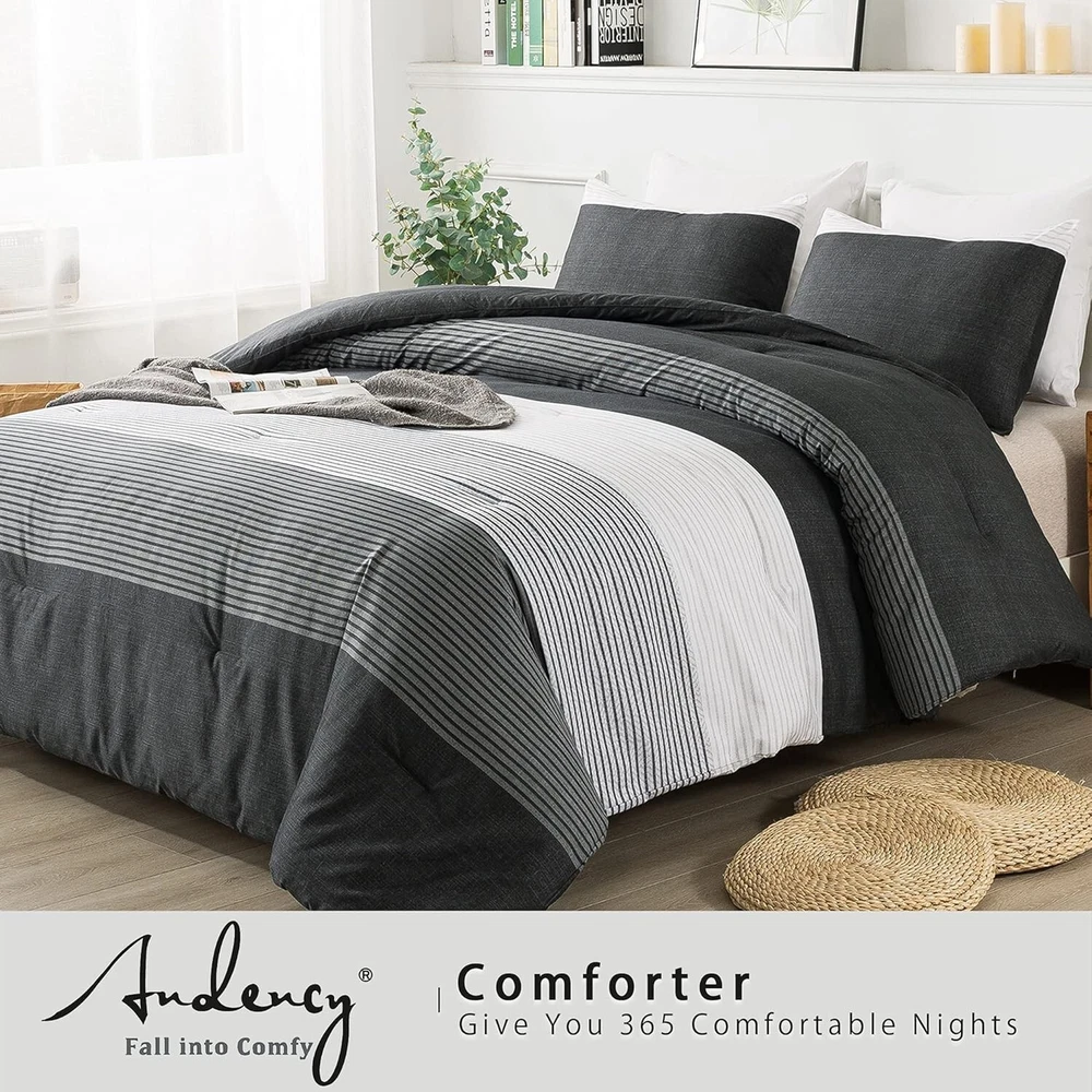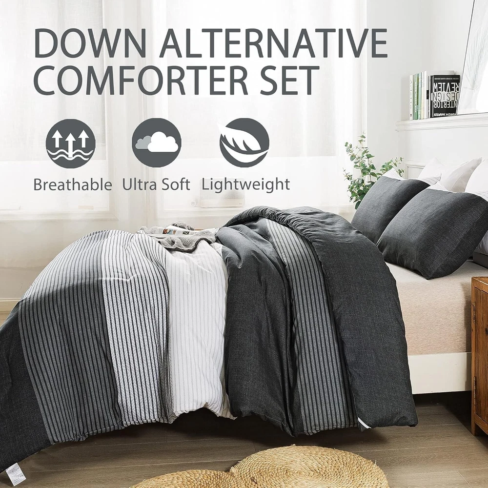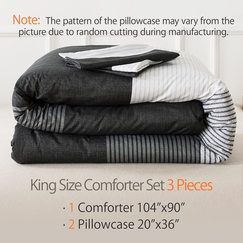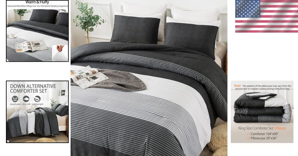 Elegant Black, White & Gray King Comforter Set - Weather-Resistant & Fluffy ‹ › ‹ › ‹ › ‹ › ‹ › ‹ › ‹ › ‹ › ‹ › Elegant Black, White & Gray King Comforter Set -Weather-Resistant & Fluffy Features: Striped Pattern: Concise stripe pattern redesigned with a modern and elegant 3-color patchwork, adding a sophisticated flair to any bedroom. Soft as a Cloud: Crafted with double brushed microfiber for a super soft, down alternative comforter that's breathable and skin-friendly. Adequate Filling: Advanced 3D spiral distributed microfiber filling ensures lightweight fluffiness while accommodating various sleeping postures. Durable & Easy Care: High-density smooth surface is resistant to tearing and fading, machine washable for your convenience. Complete Set: Includes one king comforter (104x90 inches) with corner loops for duvet cover attachment and two pillowcases (20x36 inches) with an elegant envelope closure. Benefits: Transform your bedroom with a sophisticated and modern look. Indulge in the luxurious softness and comfort that enhances your sleep experience in all seasons. The fluffy filling provides exceptional support while remaining lightweight, ensuring a cozy night’s sleep. Durable and easy to care for, providing long-lasting use and effortless maintenance. Perfect gift option for those seeking elegance and comfort in home decor. Why choose our King Comforter Set? Your bedroom deserves an upgrade, and our Elegant Black, White & Gray King Comforter Set is the perfect choice. With its unique design and superior comfort, this set promises to revive your space while enhancing your sleeping experience. The exceptional softness against your skin and the thoughtfully designed construction make it an essential addition to your sanctuary. Don’t settle for ordinary—elevate your comfort and style with this exquisite comforter set. Order yours today and transform your bedroom into a haven of luxury. Shipping Free & Fast Shipping - We offer free shipping to most of the USA with a normal delivery time of 3-7 days. However, due to the current situation, additional delivery time (up to 3 weeks) may be required for some items. Alternative Carriers - We may use alternative carriers (e.g. USPS, FedEx, UPS, etc.) to ensure your package arrives safely and on time. Due to the use of multiple carriers, we are unable to provide a tracking number automatically. Handling Time - Orders are processed and shipped within 1-2 business days of receiving cleared payment. Shipping Restrictions - Shipping to Alaska, Hawaii, Puerto Rico, Guam, and other US territories may incur shipping charges or delivery restrictions. Please contact us before ordering, or your order can be refunded/cancelled. State Restrictions - There may be restrictions based on your state of purchase. For example, certain items may not be shipped to California due to state regulations. Contact for Tracking Updates - If you require tracking updates or have any concerns about the delivery of your order, please feel free to contact us, and we will be happy to assist you. Return 30-Day Hassle-Free Returns - We want you to be completely satisfied with your purchase. If you are not, you can return the item within 30 days of receiving it for a full refund or exchange. Easy Return Process - To start a return, simply contact us and we will provide you with a prepaid return shipping label and detailed instructions. Restocking Fee - There are no restocking fees for returns. However, the buyer is responsible for return shipping costs if the return is not due to a seller's error. Refund Processing Time - Refunds will be processed within 5 business days of receiving the returned item in its condition. Payment We accept all major credit cards, PayPal, and Apple Pay for your convenience. Your payment information is secure and encrypted to ensure a safe and seamless transaction. Please complete your payment within 3 days of purchase to avoid any delays in shipping. Feedback Your feedback is extremely important to us. We strive to provide the best products and customer service possible. If you are satisfied with your purchase, please take a moment to leave us a positive review. If you have any concerns or issues with your order, please contact us before leaving negative feedback. We are committed to resolving any problems and ensuring your satisfaction. Contact Us If you have any questions or concerns, please feel free to out to our customer support team. You can contact us through the eBay messaging system. We are available Monday to Friday, 9:00 am to 5:00 pm EST, and we will do our best to respond to your inquiry within 24 hours. Buy it now and enjoy a pleasant shopping experience! Set Includes: Comforter,Pillowcase Material: Microfiber,soft brushed microfiber Features: Down Alternative,super soft,breathable,comfortable,lightweight,fluffy,skin-friendly,durable,easy care Theme: Striped, Modern Care Instructions: Machine Wash,Gentle cycle,Air dry,Tumble dry low heat,Do not bleach,Do not iron,Wash before first use Department: Unisex Baby & Toddler,Kids,Teens,Adults Room: Bedroom Size: King Type: Comforter Set Color: Black Fill Material: Microfiber Pattern: Striped Insulation: All Seasons Number of Items in Set: 3 Style: Modern Season: All Closure Type: Envelope Thread Count: 200 or Less GSM (Grams per Square Meter): 301 to 450