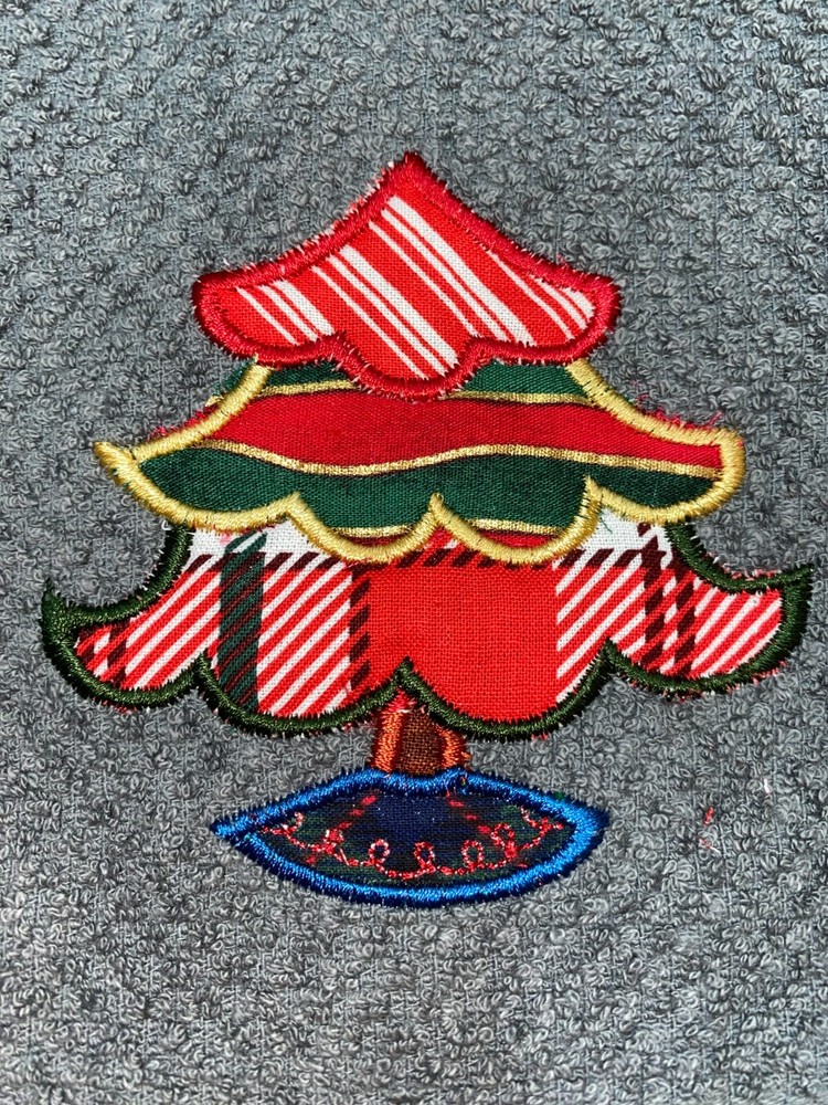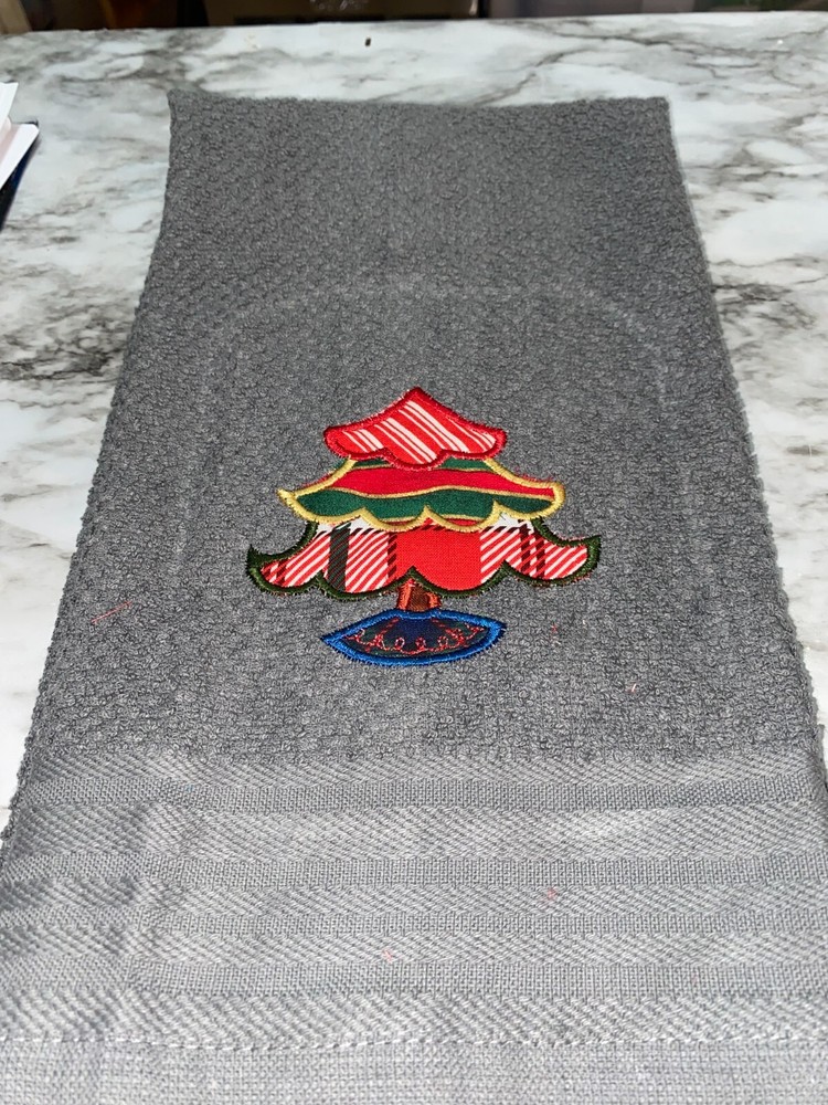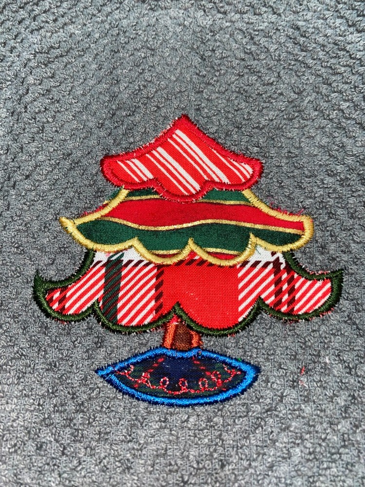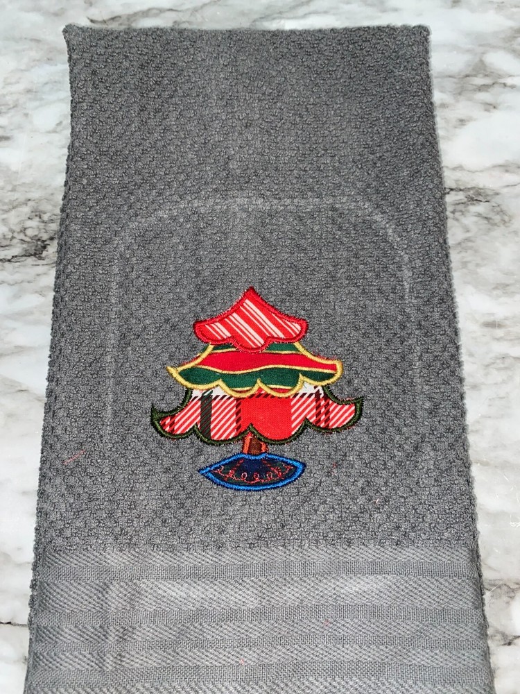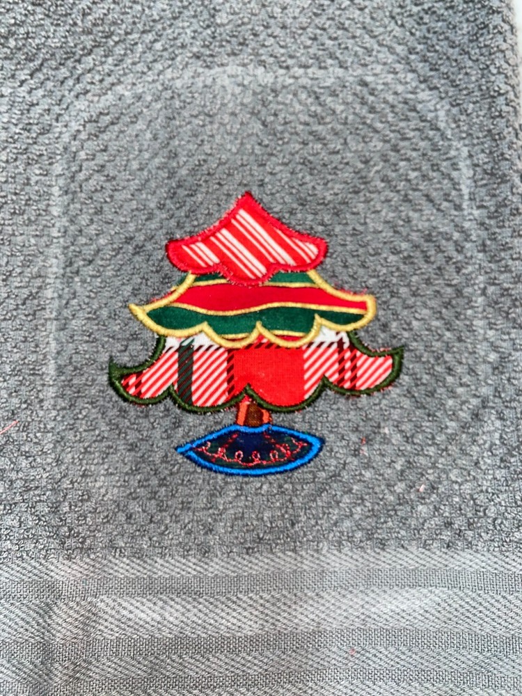 Embroidered Appliqued Gray 100% Cotton Mainstays Kitchen Hand Towel Christmas Tree Theme Assorted Fabrics BS3064 Design is approx. 3.5" x 4" Hand Towel 15" x 25" Note: Some clear water soluble stabilizer may remain and will wash out. Thank you for your business.