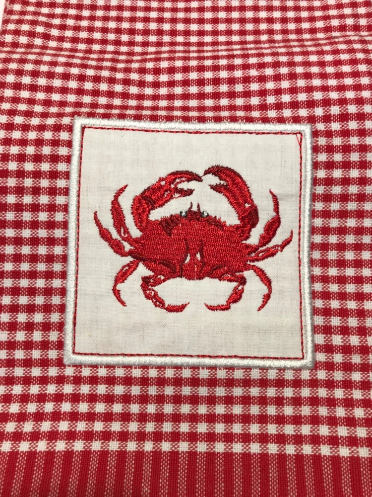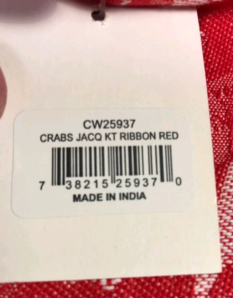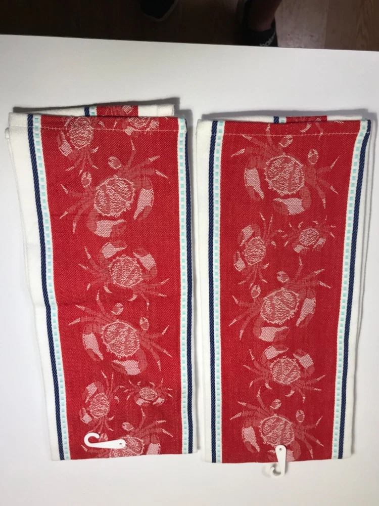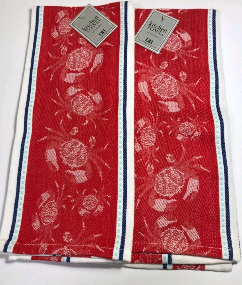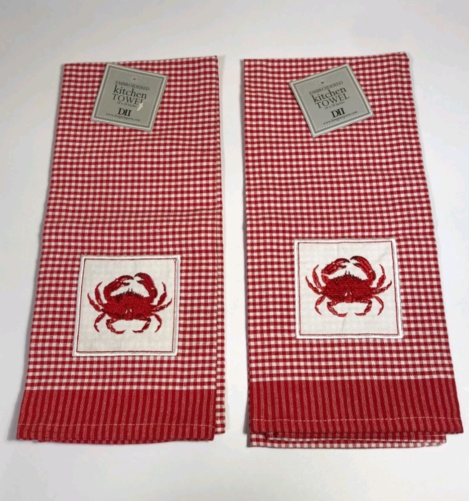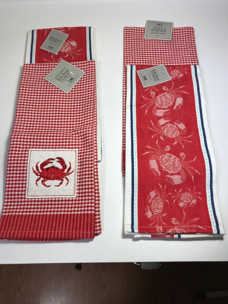 Set of 4 Crab Kitchen towels by Design Import. 2 Sets of 2 cotton towels featuring Crabs. One set is des and white checked with an embroidered applique crab. On and the other set is a Jacquard crab red white with blue and striped pattern design. These versatile towels are perfect for parties, beach houses, summer gatherings, and everyday kitchen use. Made of 100% cotton, they are machine washable up to 100°F for easy care. Made in India. With a traditional classic style and nautical theme, these towels add a touch of fun and style to your home decor. Two sets of two. 4 coordinating kitchen towels all together. Both sets are new with tags Design Imports, Dii. Brand New Condition.