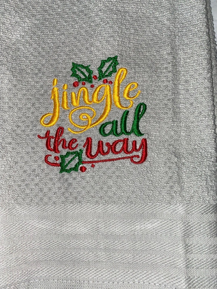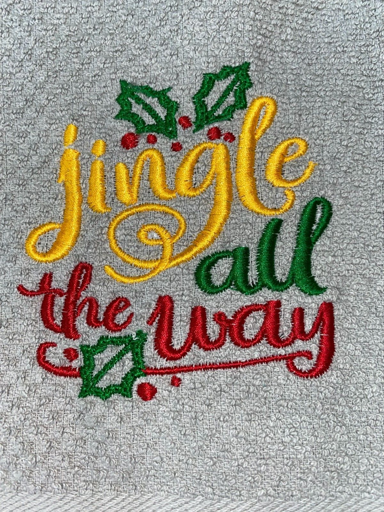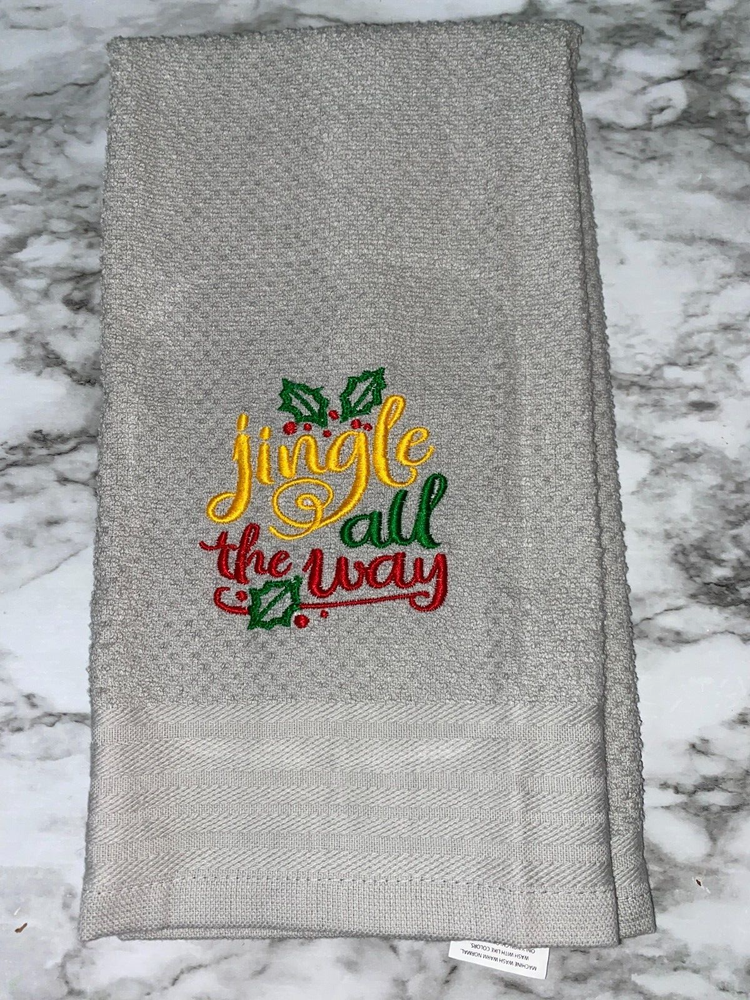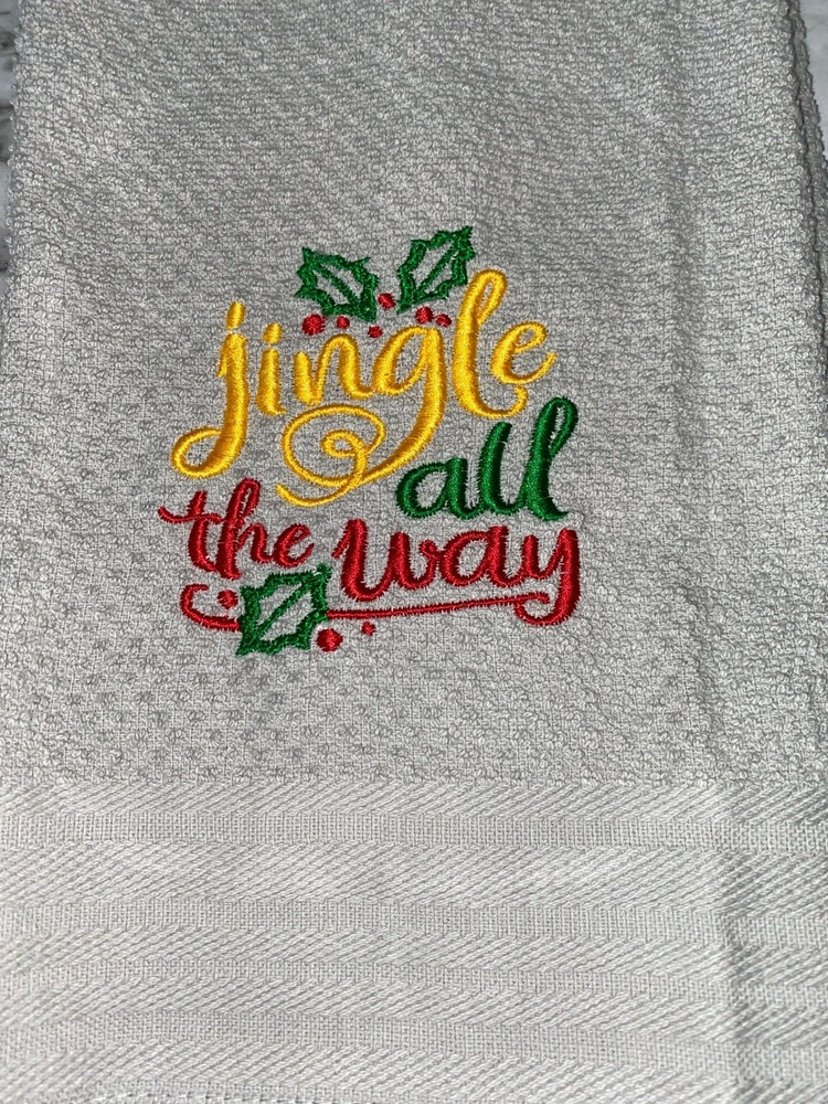 Embroidered Red Mainstays 100% Cotton Kitchen Hand Towel Christmas Theme Jingle All The Way BS2946 Design is approx. 4" x 4" Hand Towel 15" x 25" Note: Some clear water soluble stabilizer may remain and will wash out.