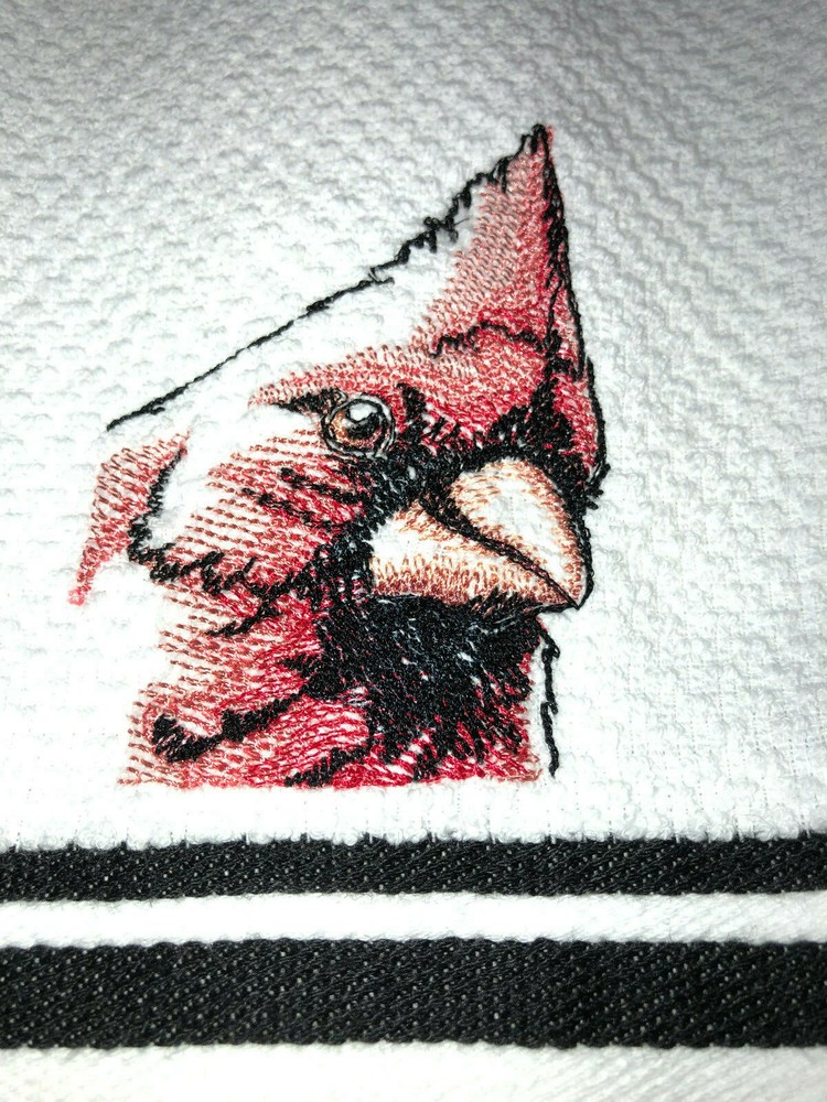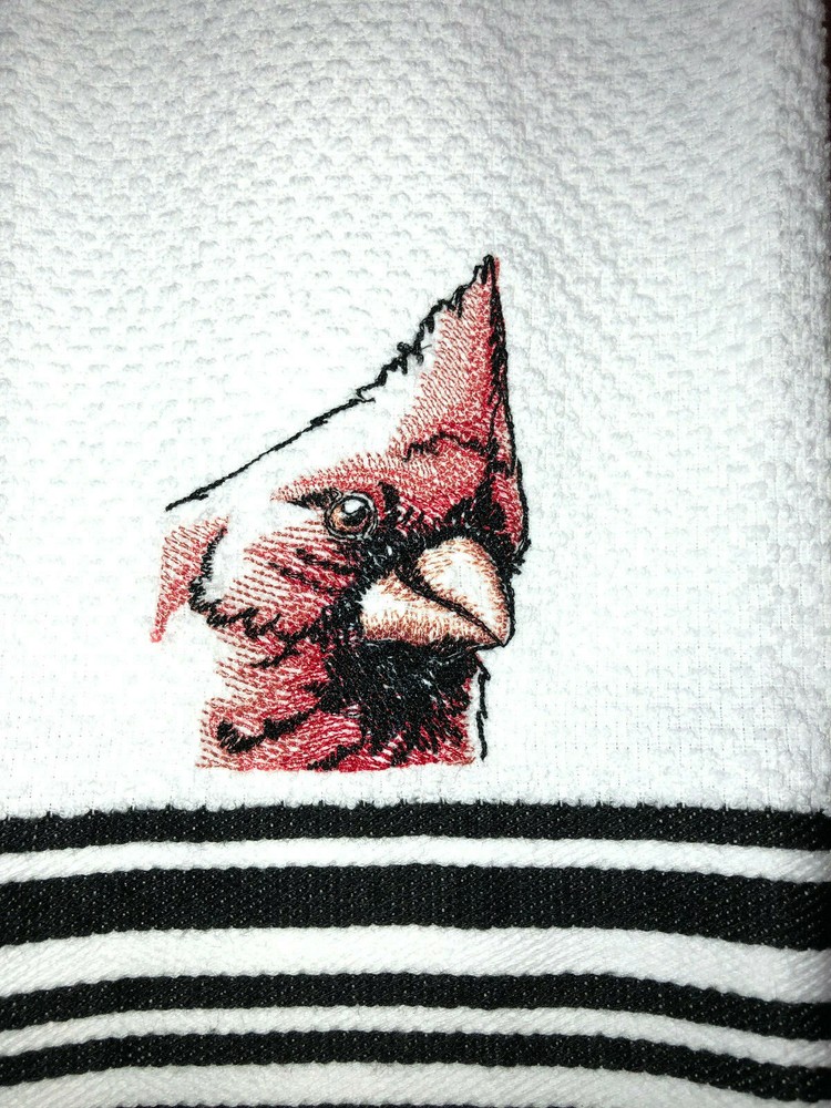 Embroidered White with Black Stripes 100% Cotton Kitchen Bar Hand Towel- Red Cardinal- Bird BS1719 Design is approx. 3" X 3" Hand Towel 15" x 25" Note: Some clear water soluble stabilizer may remain and will wash out. Thank you for your business!