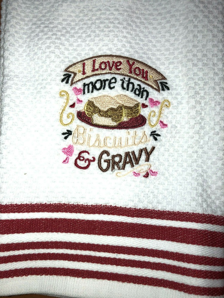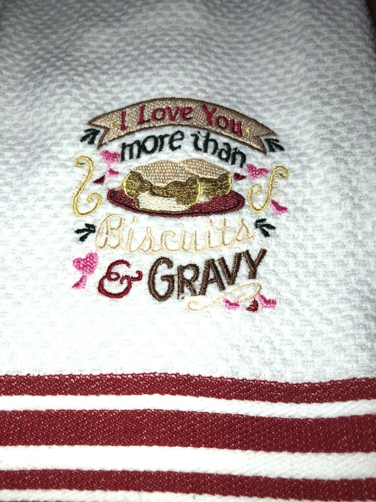 Embroidered White with Red Stripes- Kitchen Hand Towel I love you more than Biscuits & Gravy BS1714 Design is approx. 3.5" x 3.5" Hand Towel 15" x 25" Note: Some clear water soluble stabilizer may remain and will wash out.