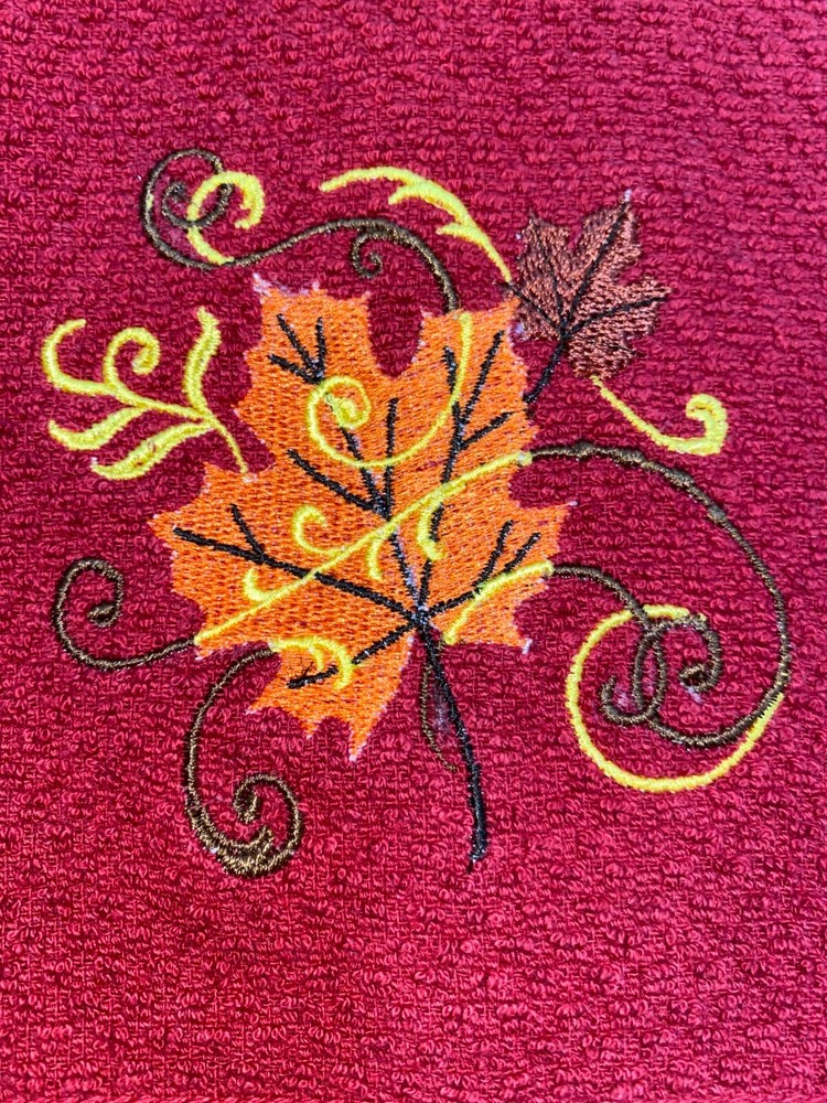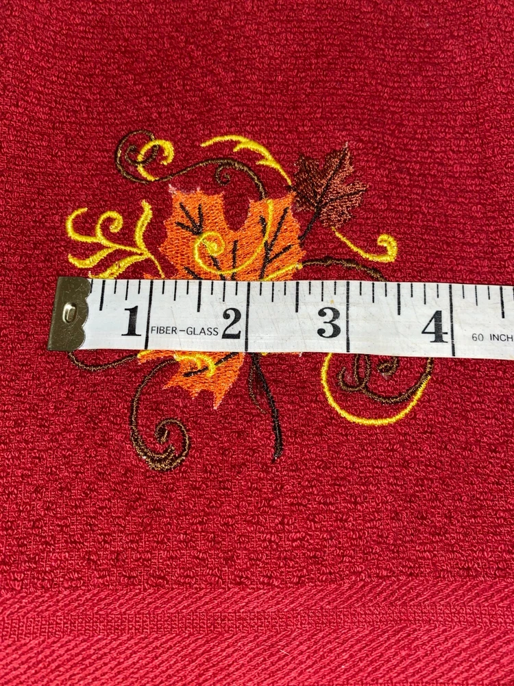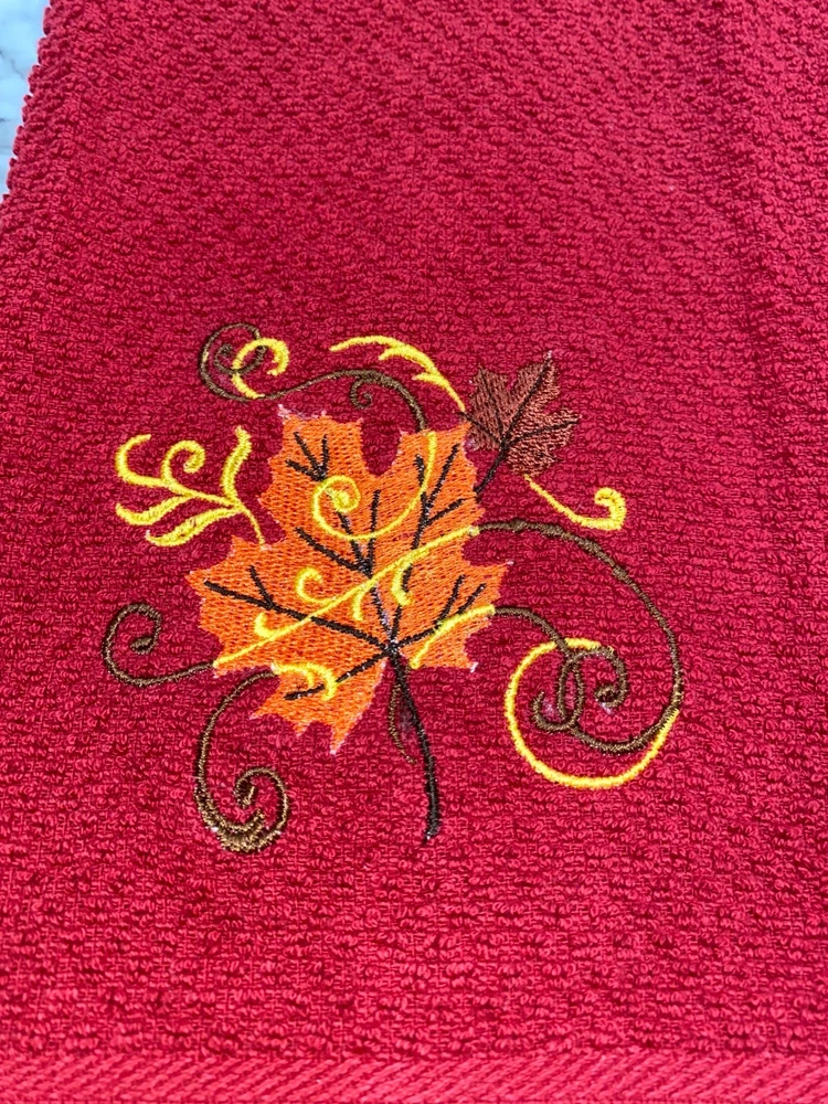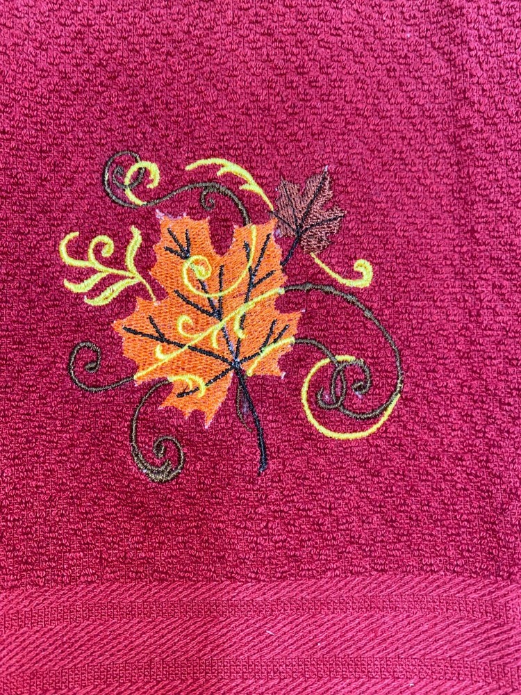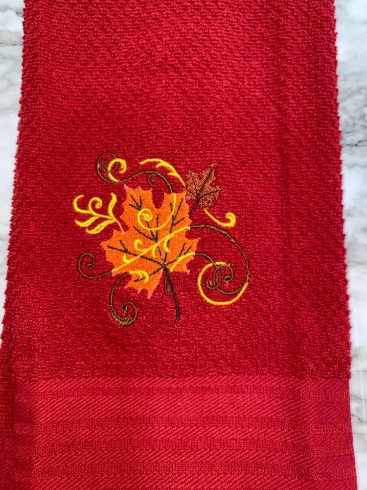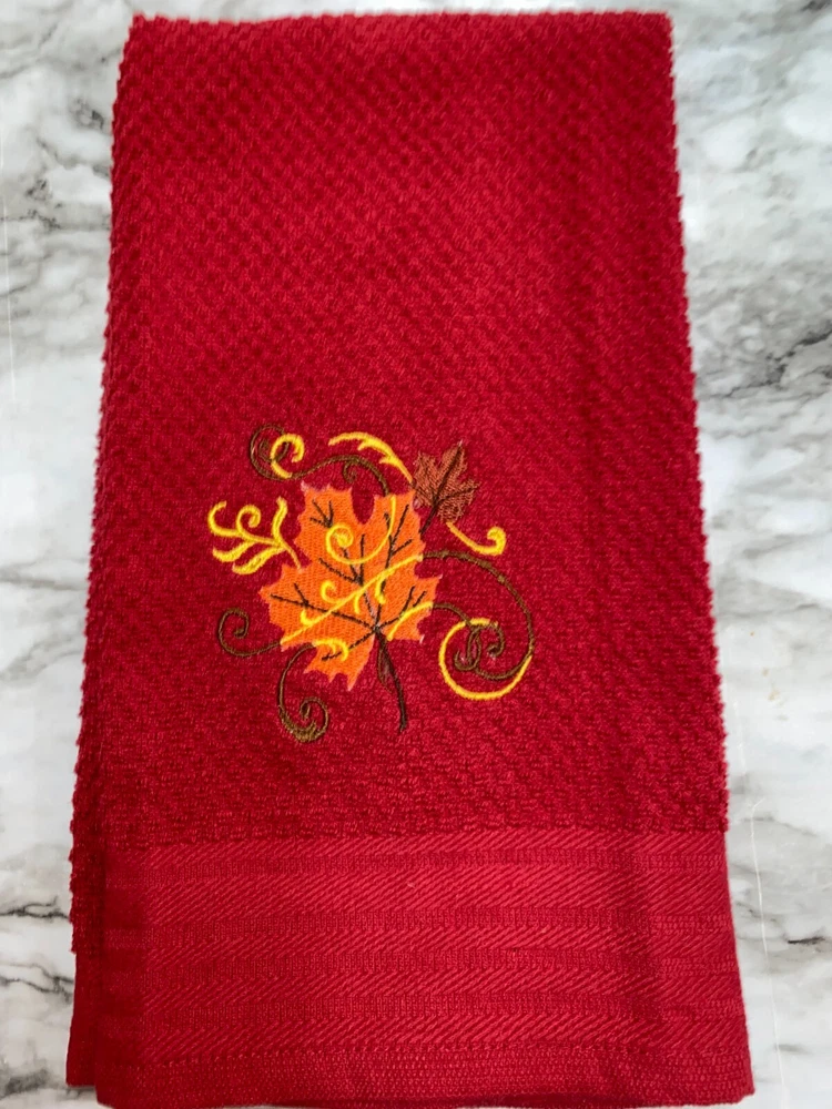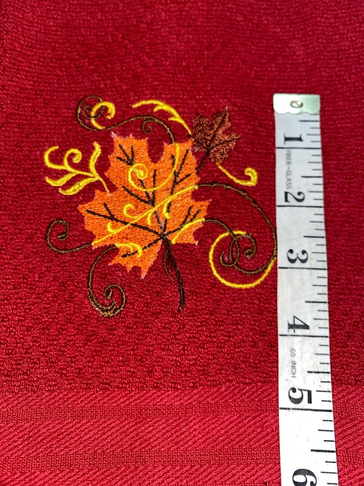 Embroidered Red Kitchen Cotton Hand Towel Fall Leaves w Filigree Swirls BS3055 Fall leaves Colorful Thanksgiving Theme with Filigree Swirls Design is approx. 4" x 3.5" Hand Towel 15" x 25" Note: Some clear water soluble stabilizer may remain and will wash out. Thank You