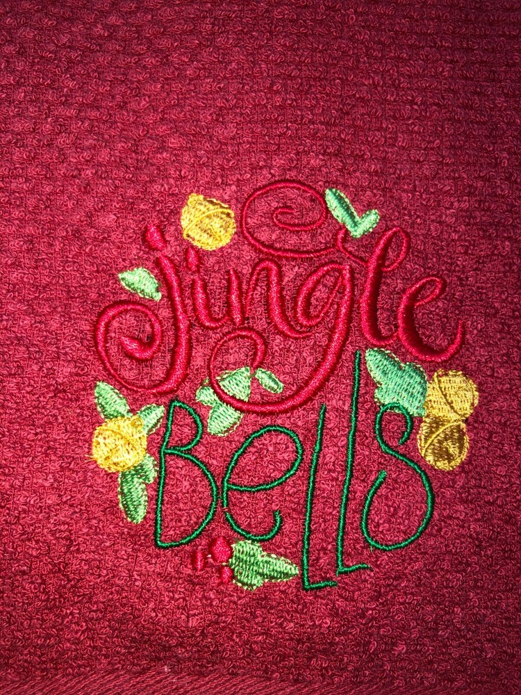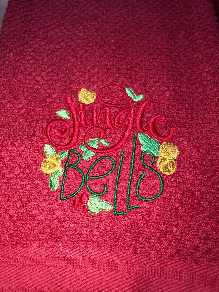 Embroidered Red Mainstays 100% Cotton Kitchen Hand Towel Christmas Theme Jingle Bells BS2626 Design is approx. 4" x 4" Hand Towel 15" x 25" Note: Some clear water soluble stabilizer may remain and will wash out.