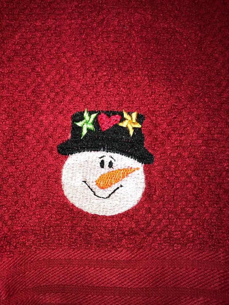 Embroidered Red Mainstays 100% Cotton Kitchen Hand Towel Winter Christmas Snowman BS253 Design is approx. 2.5" x 3" Hand Towel 15" x 25" Note: Some clear water soluble stabilizer may remain and will wash out. Thank you for your business.