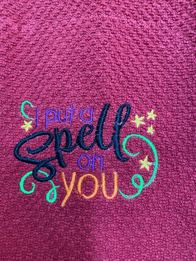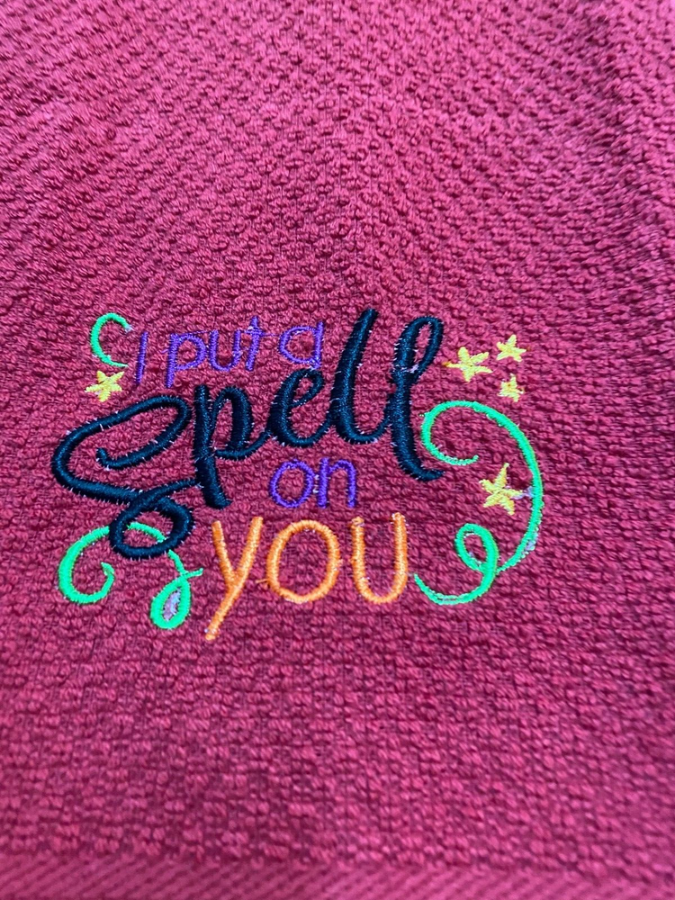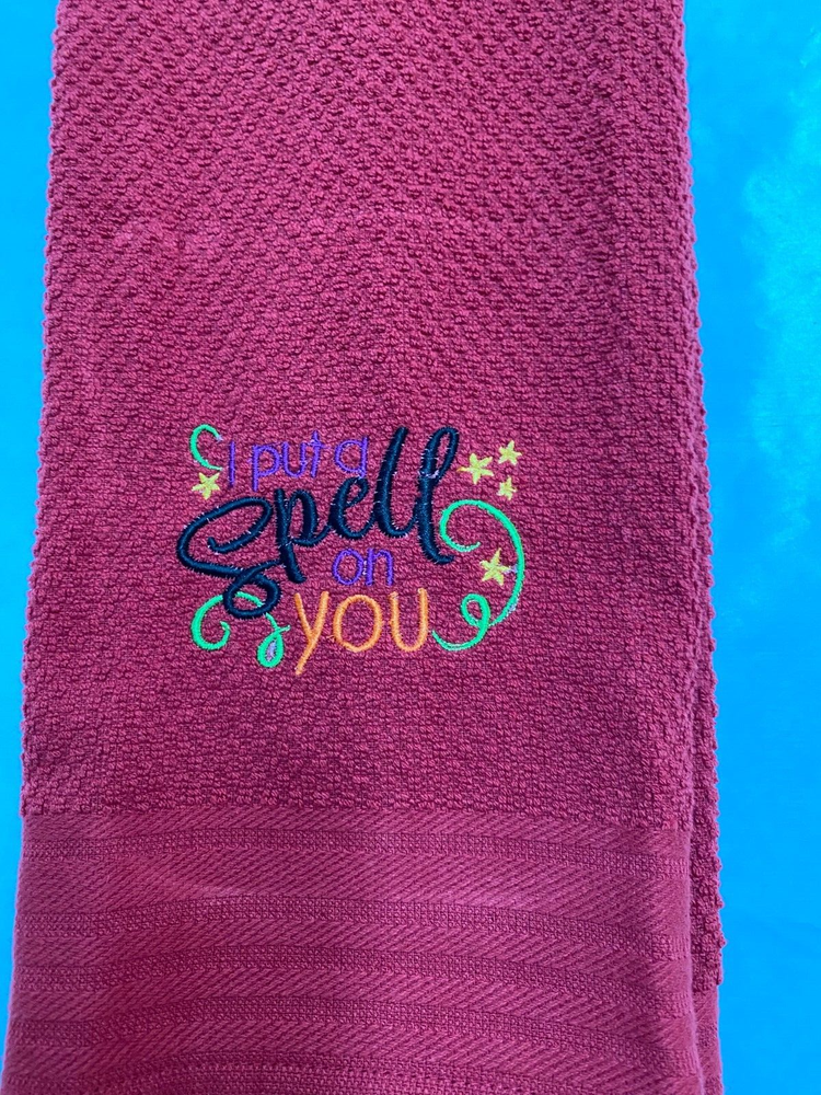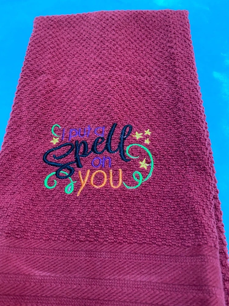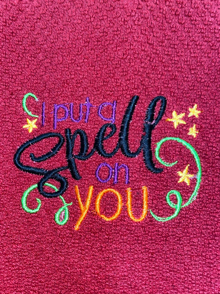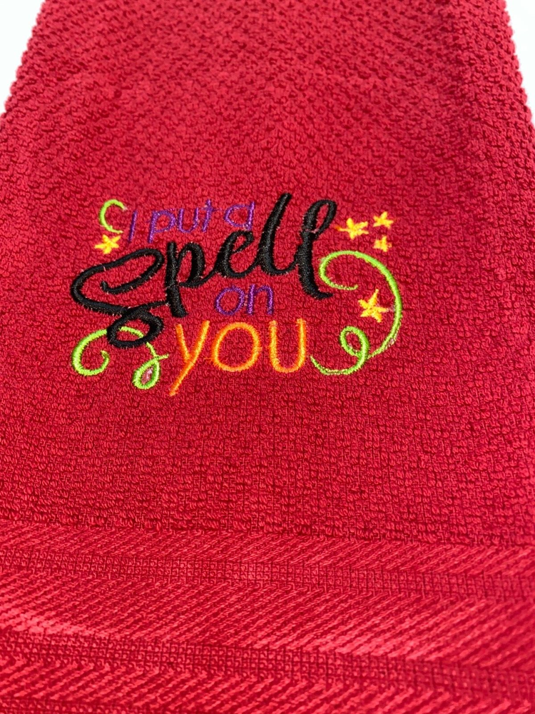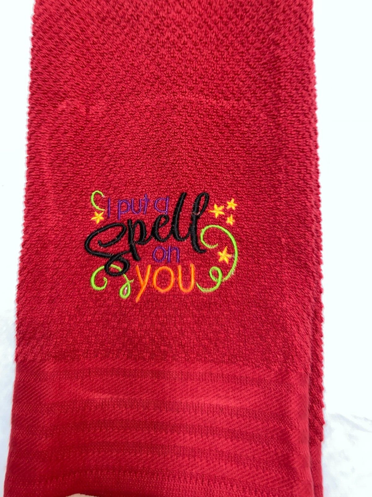 Embroidered Red 100% Cotton Mainstays Kitchen Hand Towel Halloween Theme I Put a Spell on You BS2893 Design is approx. 4" x 3" Hand Towel 15" x 25" Note: Some clear water soluble stabilizer may remain and will wash out. Thank You