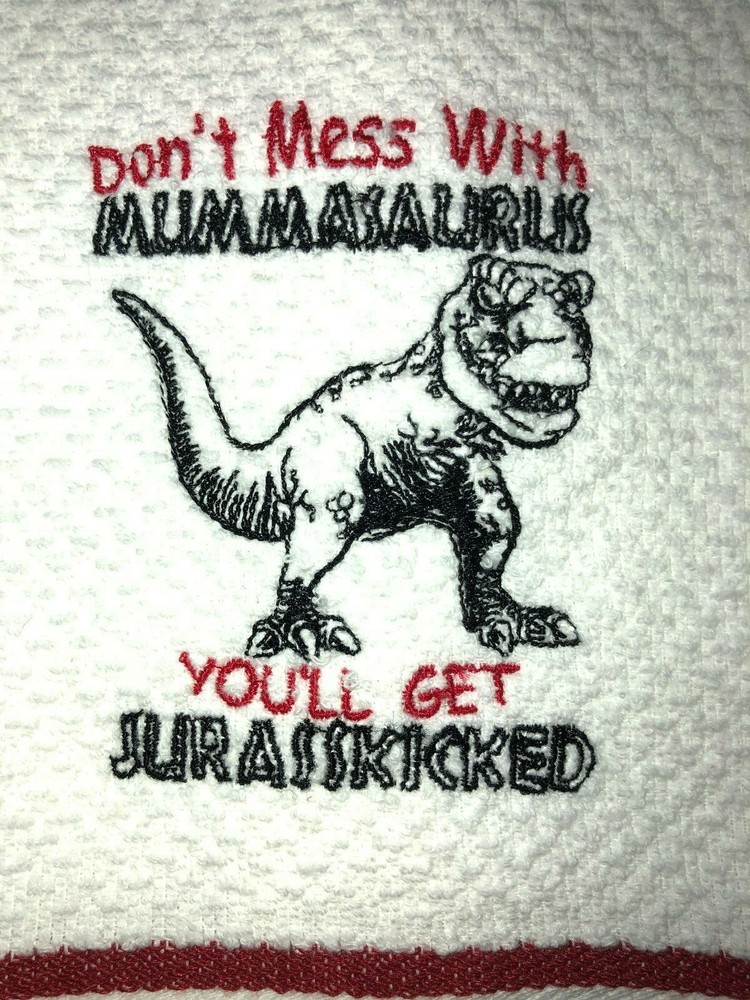 This kitchen towel is so fun and well-made! The embroidered "Don’t mess with Mummasaurus" design with the tiny T-Rex adds playful personality to my kitchen. The red and white stripes are vibrant, and the fabric is soft yet durable—perfect for drying dishes or hanging as decor. Love that any leftover stabilizer washes out easily. A great gift or treat for yourself!
