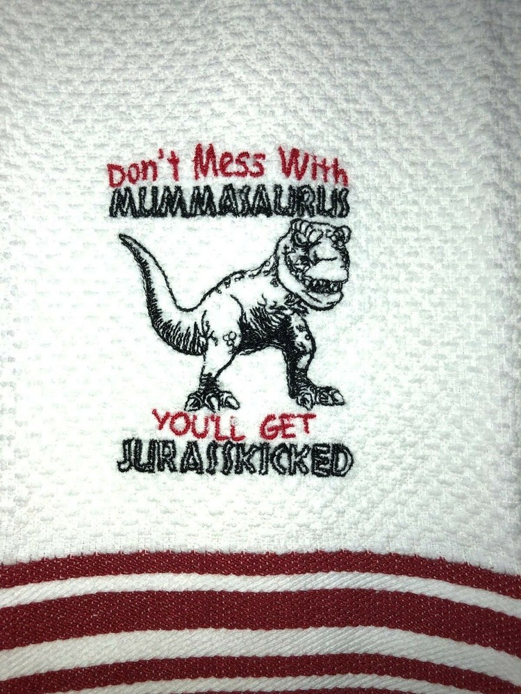 Embroidered White and Red Striped Kitchen Hand Towel Don't mess with Mummasaurus- T Rex Dinosaur BS1361 Design is approx. 3" x 4" Hand Towel 15" x 25" Note: Some clear water soluble stabilizer may remain and will wash out. Thank you