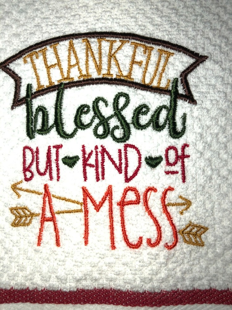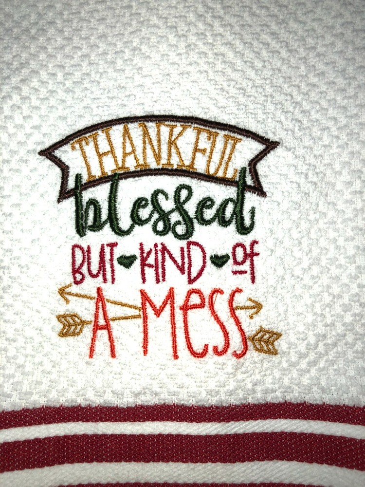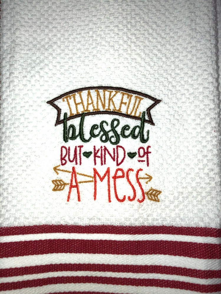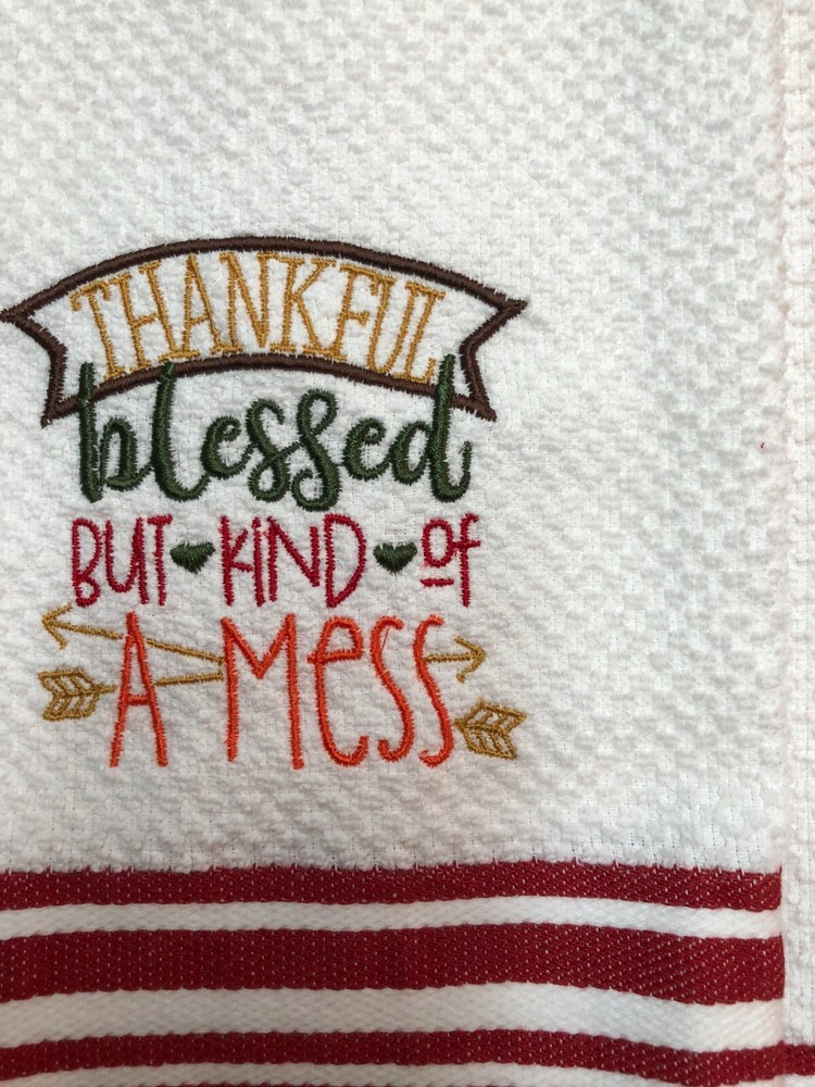 Embroidered White with Red Stripes Cotton Mainstays Kitchen Hand Towel Thankful Blessed and kind of a Mess Thanksgiving Theme BS2574 Design is approx. 3.5" x 4" Hand Towel 15" x 25" Note: Some clear water soluble stabilizer may remain and will wash out. Thank you