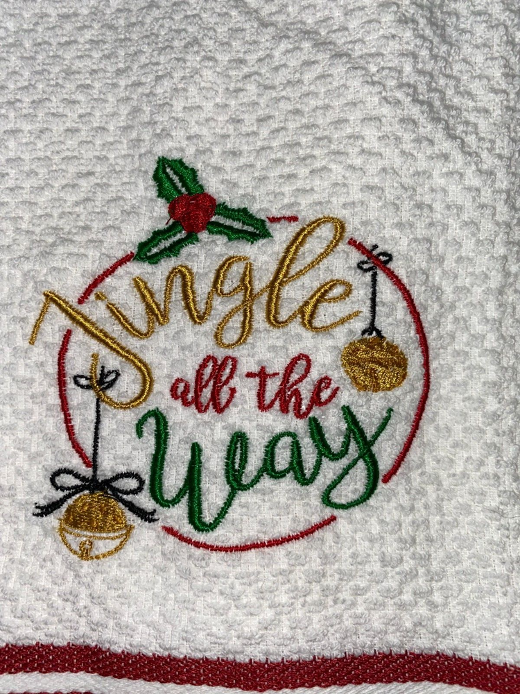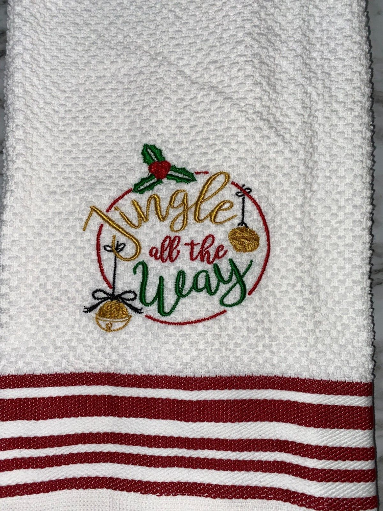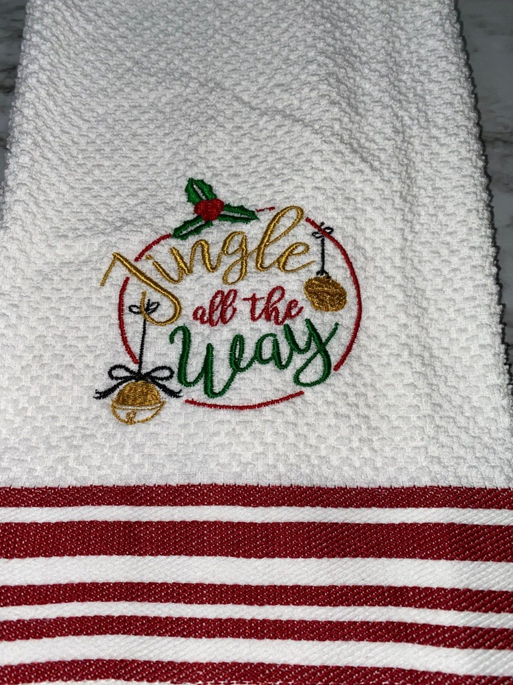 Embroidered White w Red Striped 100% Cotton Kitchen Hand Towel Christmas Theme Jingle all the way BS2950 Design is approx. 4" x 4" Hand Towel 15" x 25" Note: Some clear water soluble stabilizer may remain and will wash out.