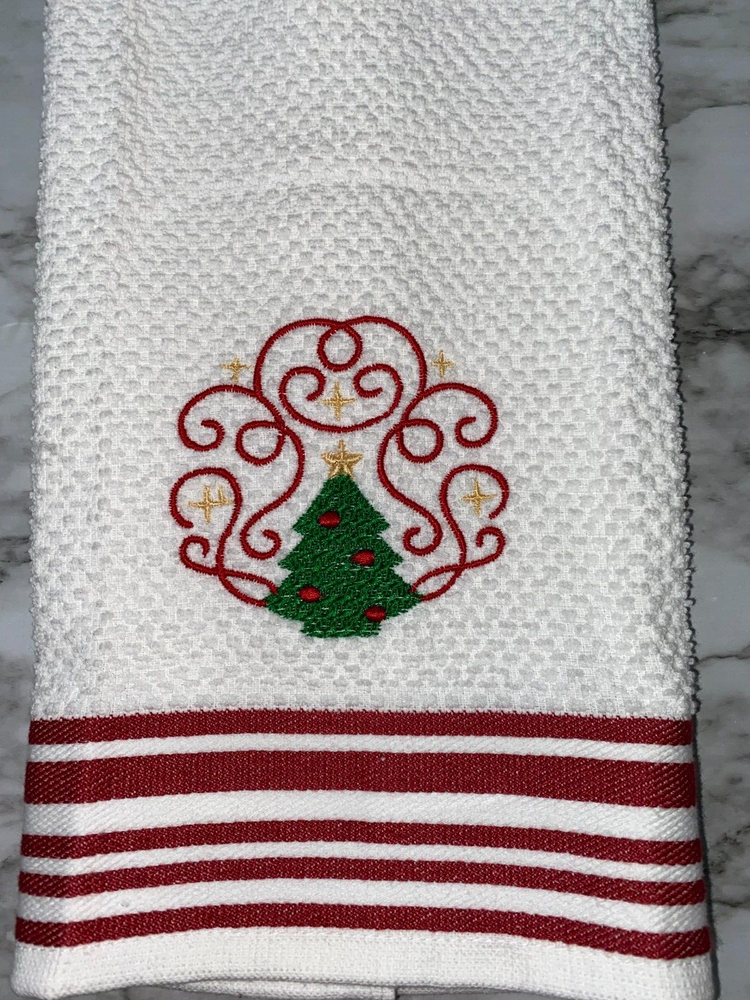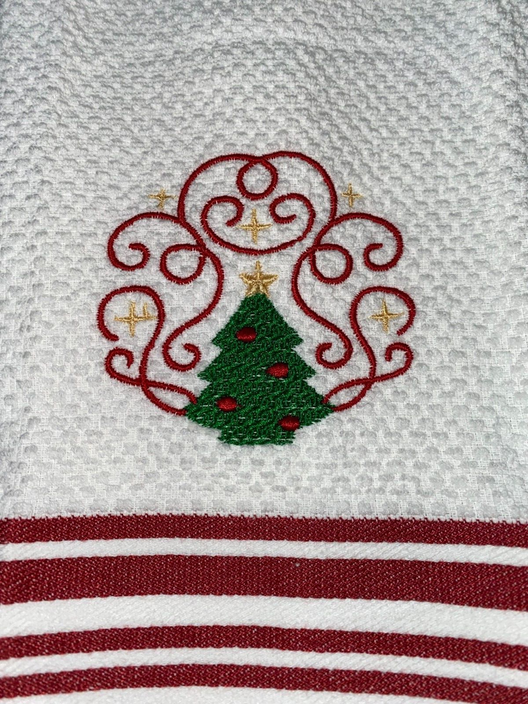 Embroidered White w Red Stripes Cotton Mainstays Kitchen Hand Towel Christmas Tree w Swirls and Stars BS2931 Design is approx. 4" x 4" Hand Towel 15" x 25" Note: Some clear water soluble stabilizer may remain and will wash out. Thank you for your business.