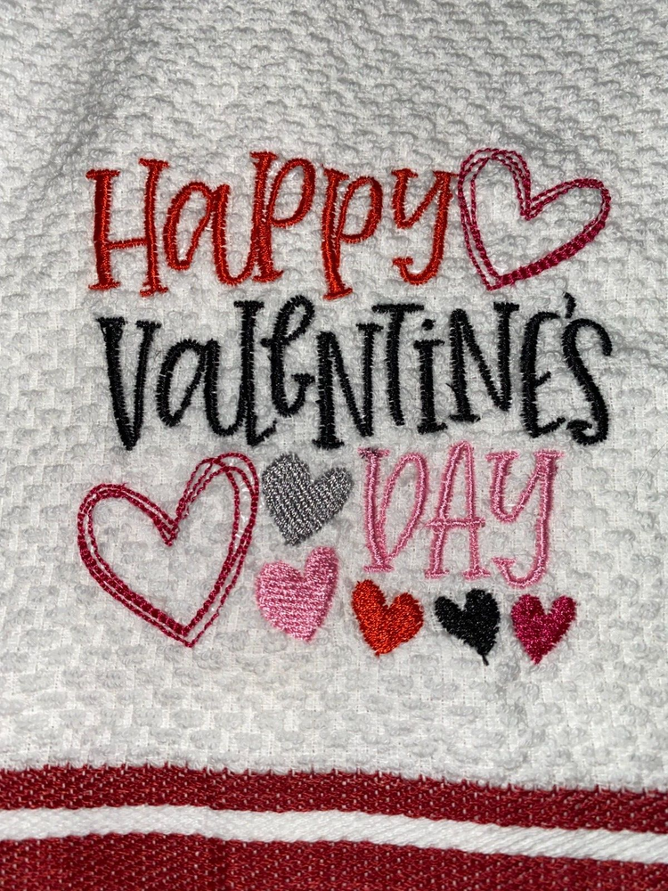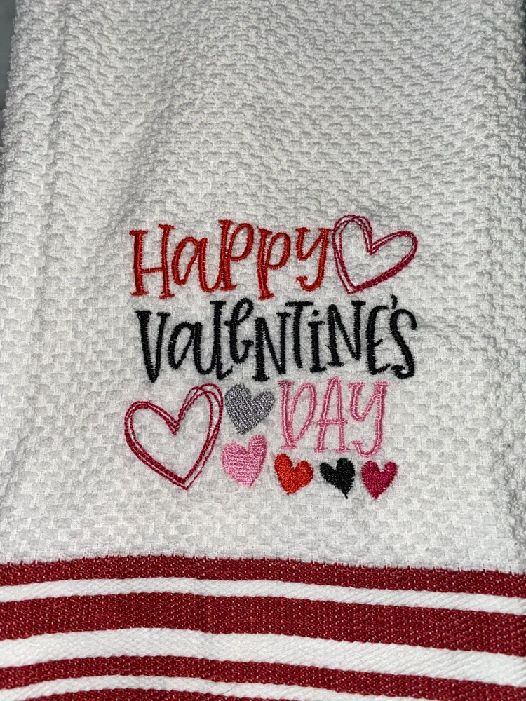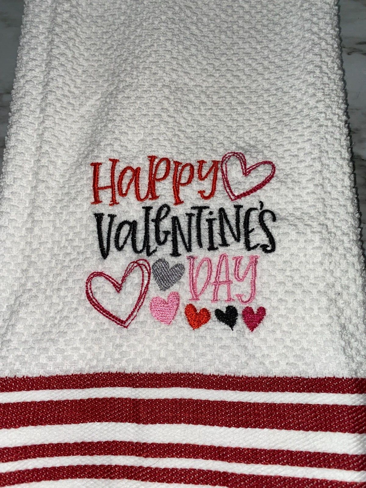 Embroidered 100% Cotton Mainstay White with Red Stripes Kitchen Hand Towel Happy Valentine's Day with Hearts BS2972 Design is approx. 4" x 4" Hand towel 15" x 25" Note: Some clear water-soluble stabilizer may remain and will wash out. Thank you!
