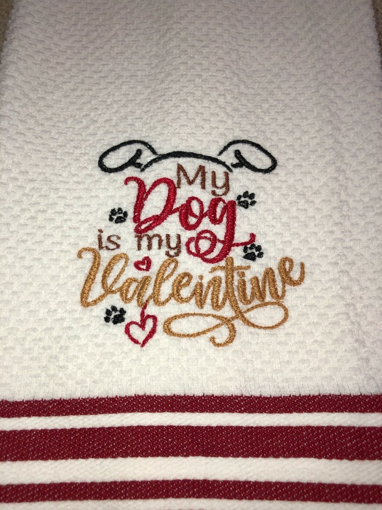 Embroidered White with Red Stripes Cotton Mainstays Kitchen Hand Towel MY DOG IS MY VALENTINE BS2367 Design is approx. 4" x 4" Hand Towel 15" x 25" Note: Some clear water soluble stabilizer may remain and will wash out. Thank you