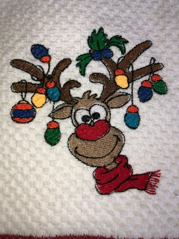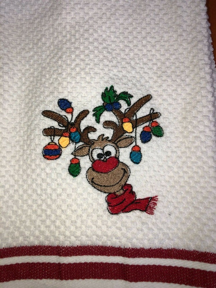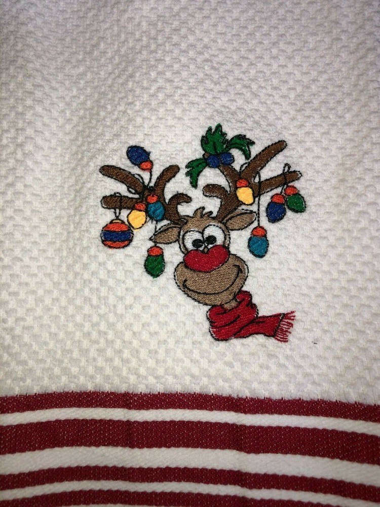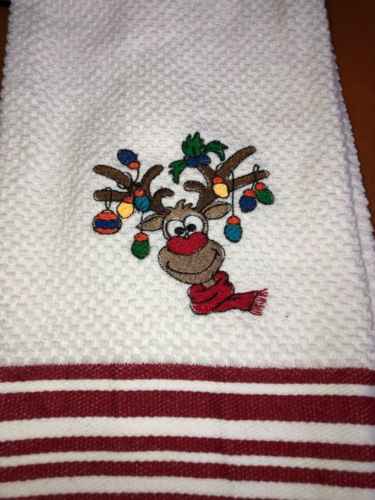 Embroidered White with Red Stripes Cotton Mainstays Kitchen Hand Towel Embroidered Striped Kitchen Hand Towel Rudolph Reindeer Christmas Tree Lights BS2614 Design is approx. 4" x 4" Hand Towel 15" x 25" Note: Some clear water soluble stabilizer may remain and will wash out. Thank you
