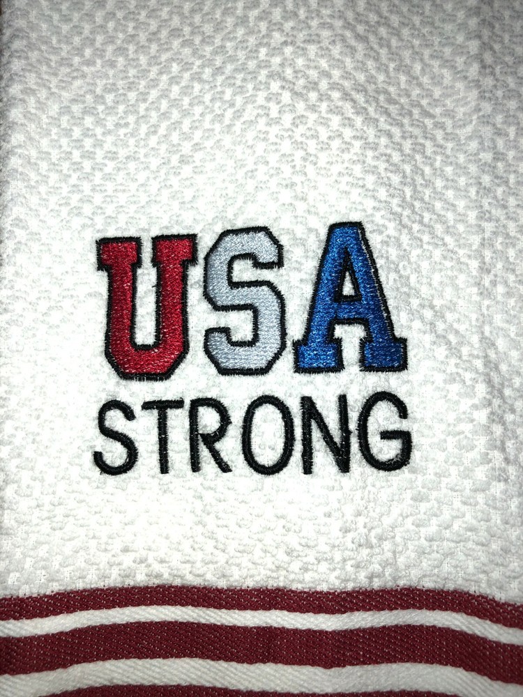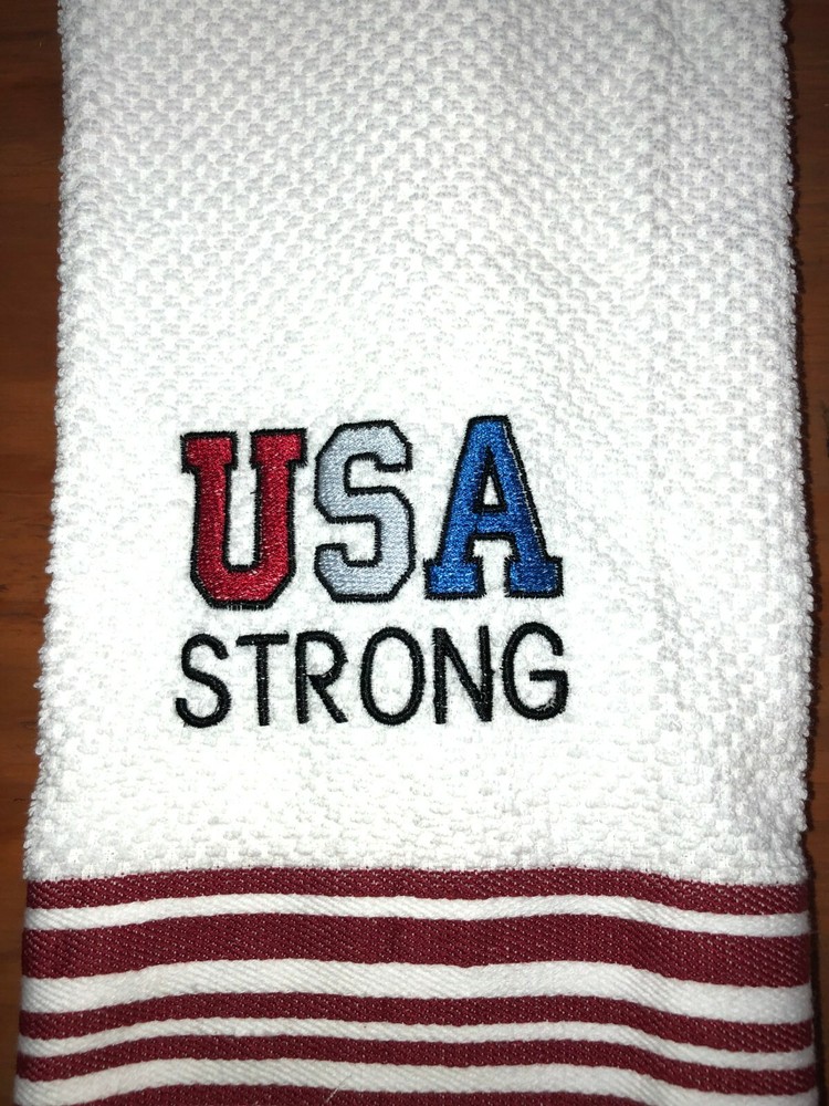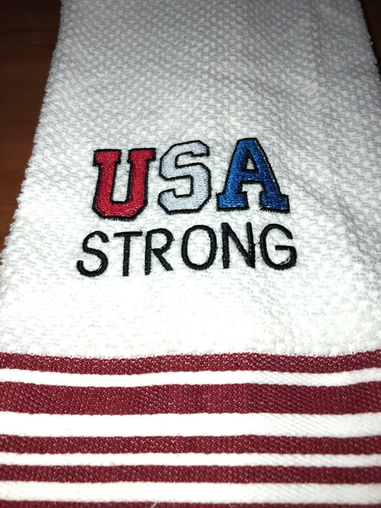 Embroidered White and Red Striped Mainstays 100% Cotton Kitchen Hand Towel USA Patriotic Theme BS2497 Design is approx. 4" x 3" Hand Towel 15" x 25" Note: Some clear water soluble stabilizer may remain and will wash out. Thank you for your business.