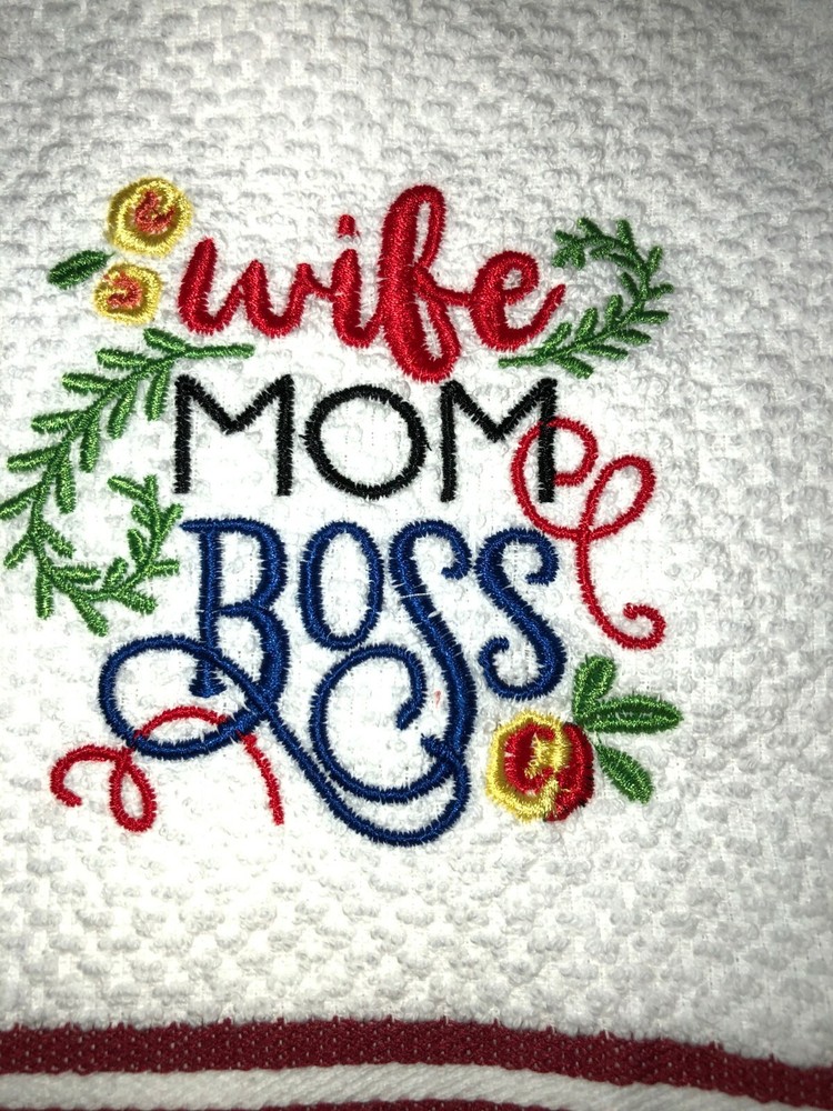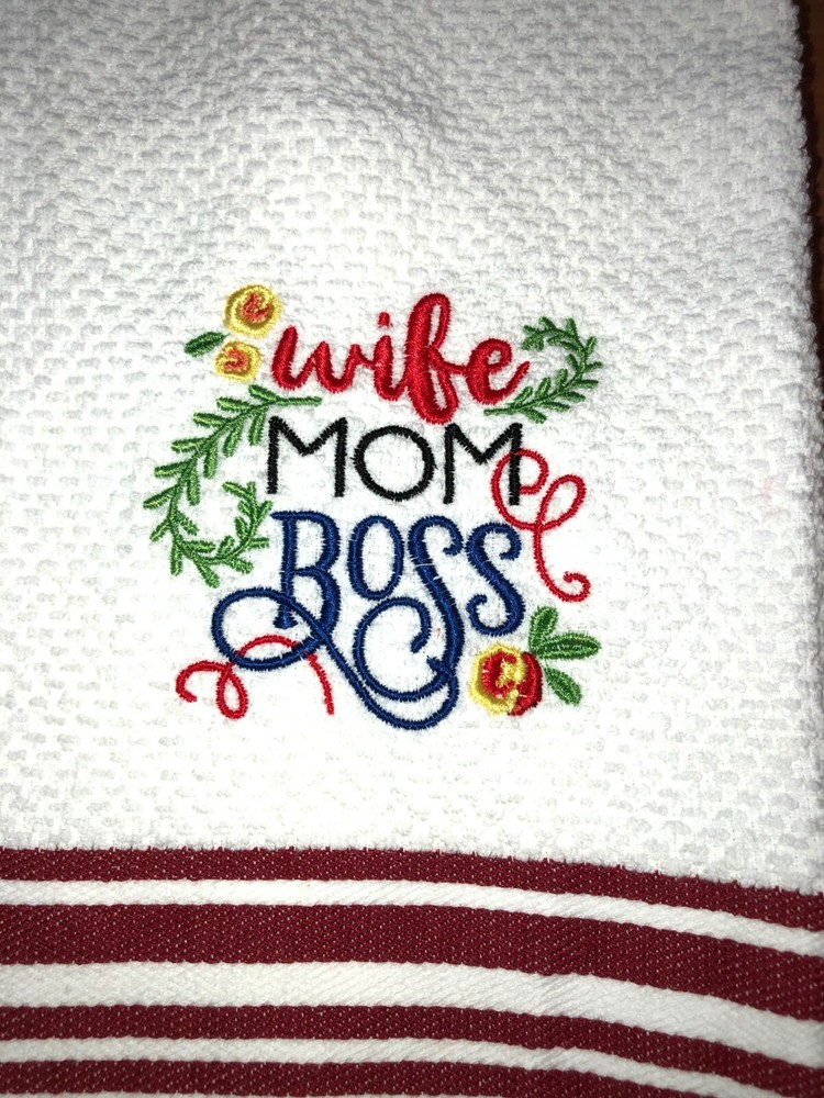 Embroidered 100% Cotton White with Red Stripes Mainstays Kitchen Hand Towel Wife Mom Boss with flowers BS2445 Design is approx. 4" x 4" Hand Towel 15" x 25" Note: Some clear water soluble stabilizer may remain and will wash out.