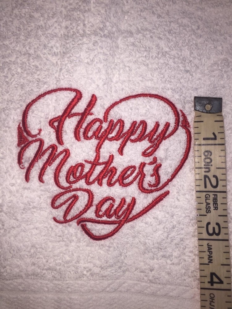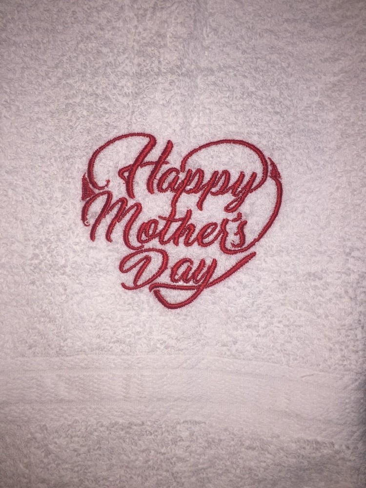 Embroidered 100% Cotton White Bathroom Hand Towel Happy Mother's Day in Heart *****Red Thread Used- HS0873 Design is approx. 4" x 3" Hand Towel 16" x 26" Note: Some clear water soluble stabilizer may remain and will wash out. Thank you