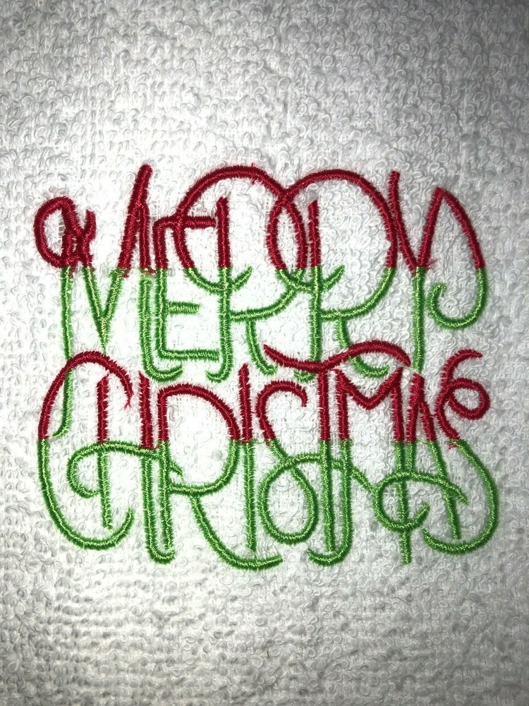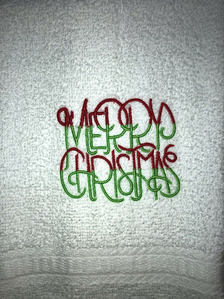Embroidered White Bathroom Hand Towel Merry Christmas with two tomes of thread- Red/Green HS1557 Design approx.: 4" x 4" Hand towel 16" x 26" Note: Some clear water soluble stabilizer may remain and will wash out. Thank you for your business!