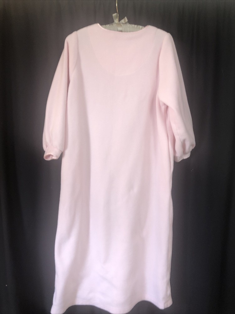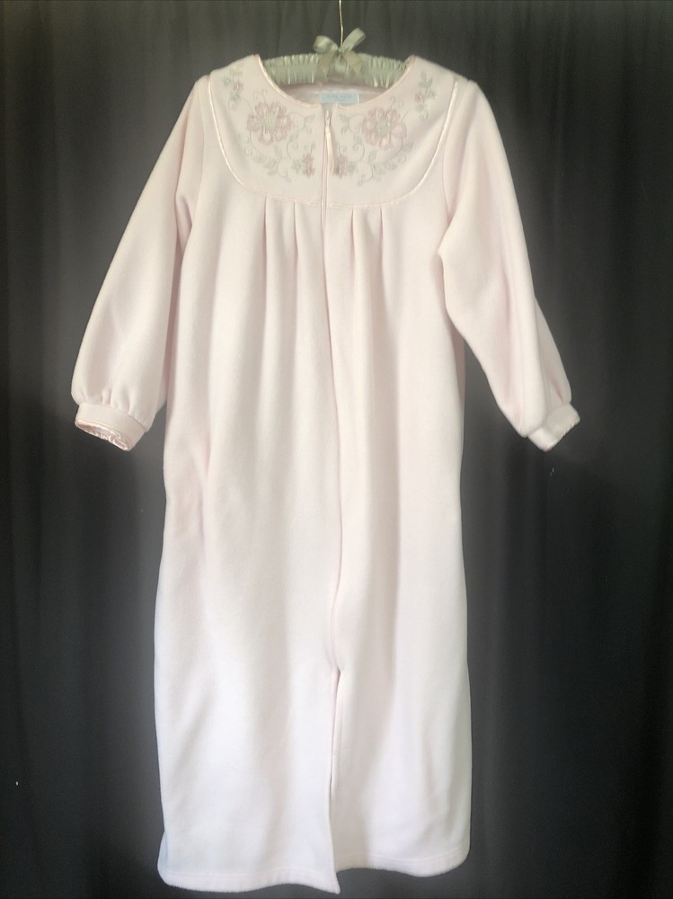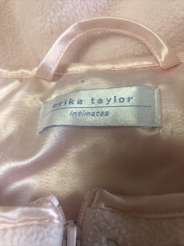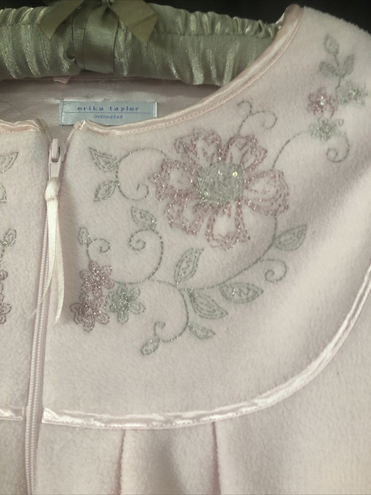 Erika Taylor Intimates Fleece Zip Front Pink Embroidered Robe Superb condition, but size tag has been removed so please compare measurements below to ensure a proper fit No stains or holes Measured across the front, laid flat: Underarm to underarm: 22.5" Shoulder to shoulder: 14" Shoulder to cuff: 20" Shoulder to hem: 48" Please preview all photos and do not hesitate to ask for any additional details on this item. Fast shipping from a smoke-free home. International buyers are responsible for any customs or import fees. Thanks for looking!