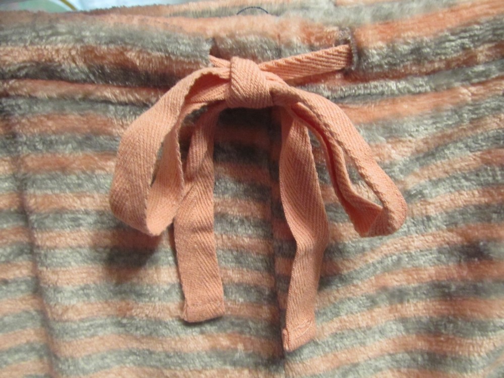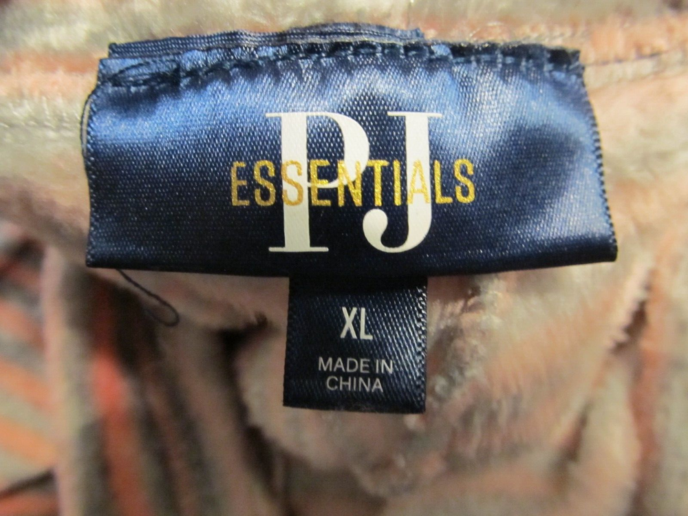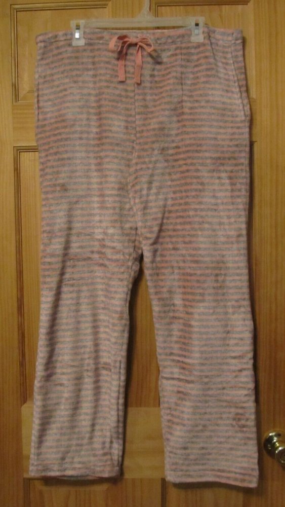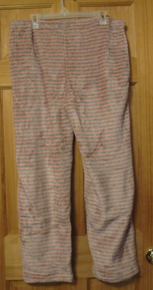 Women's Essentials PJ brand lounge pants/pajama pants are pink and gray striped pattern. Features include plush side pockets, an elastic waist and a functional drawstring at the waist. The pants measure 39" from the waist to the pant hem, an inseam of 31", and the waist is 18" across when laid flat and unstretched.