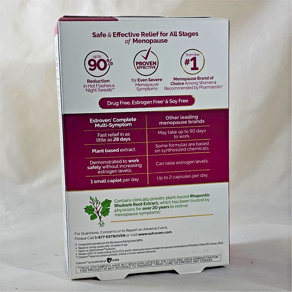 Features: Relief of all Major Menopause Symptoms Contains Clinically Proven, Plant-Based Rhaphontic Rhubarb Root Extract Faster Menopause Relief & up to 90% Reduction in Hot Flashes and Night Sweats Proven Effective for all Stages of Menopause Plant-Based Extract, Vegan, Drug, Soy, Hormone and Gluten Free