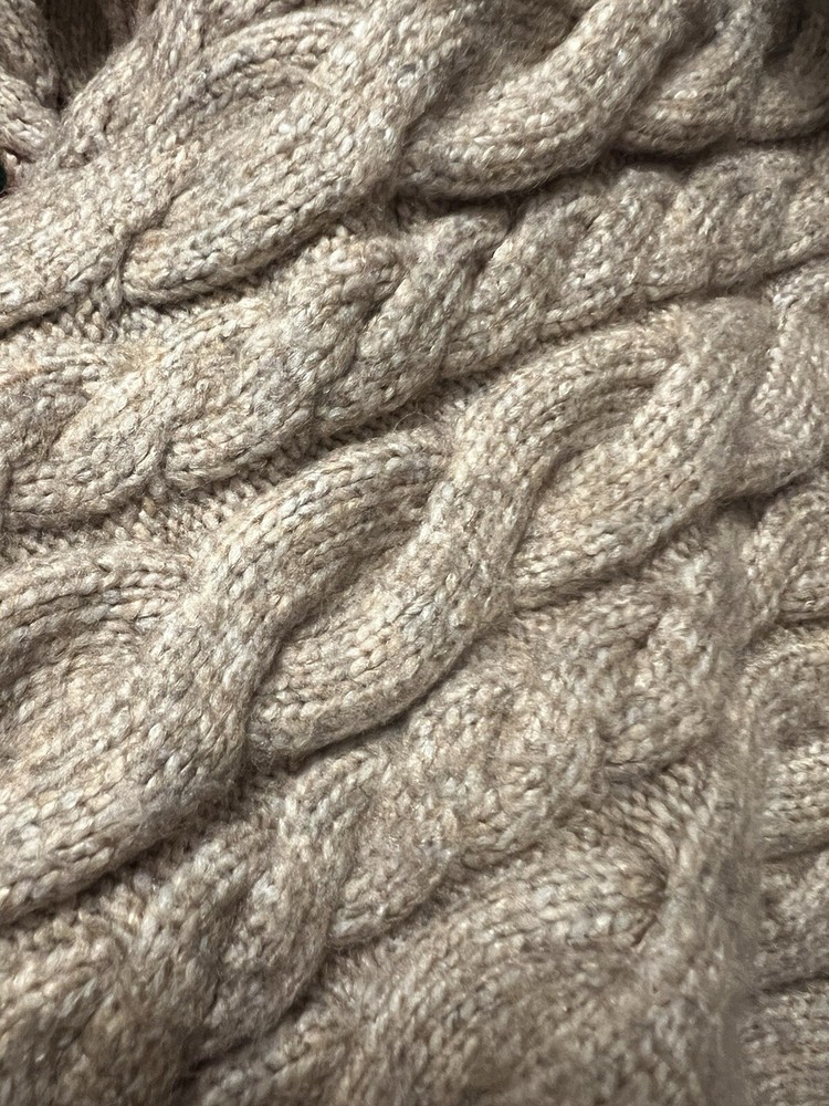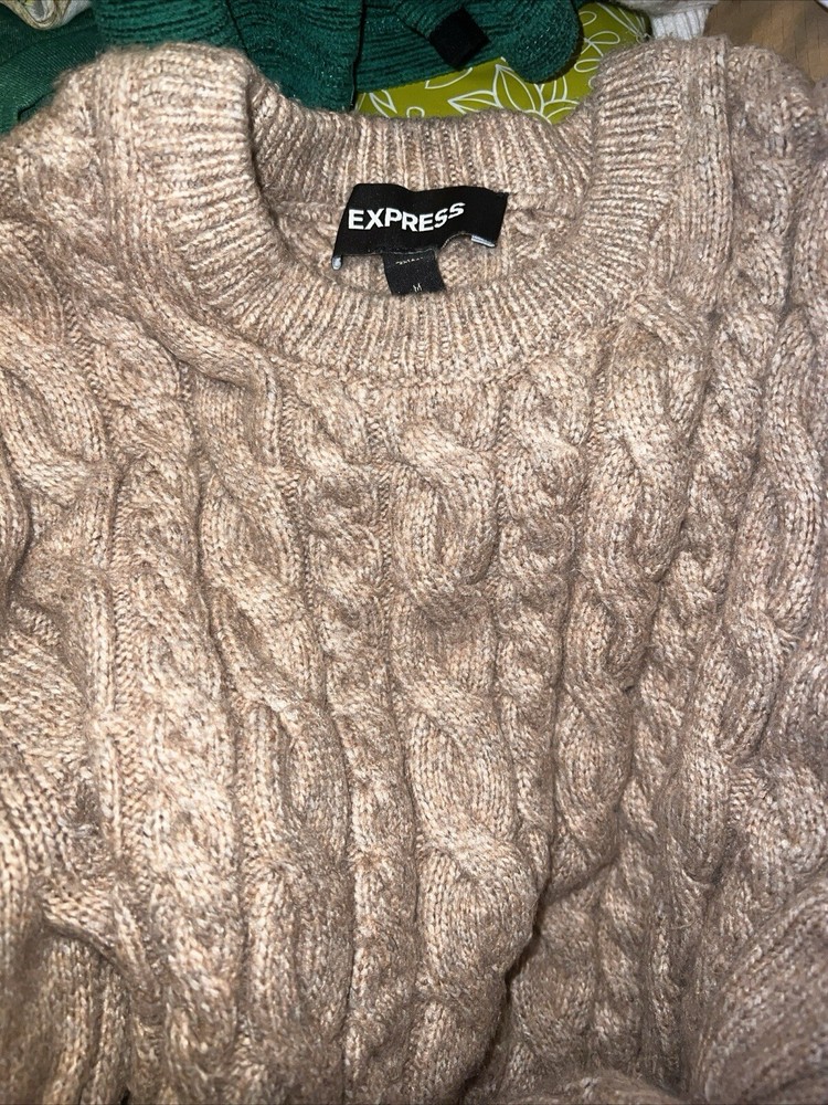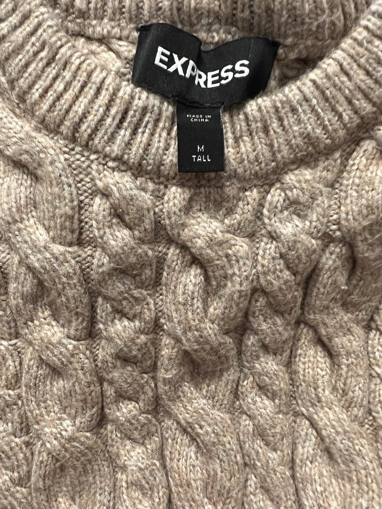 This cozy Express sweater is perfect for any occasion. The beige color and ribbed trim accents make it a stylish addition to any fall or winter outfit. The sweater is made of a soft and comfortable blend of polyester, nylon, and viscose, ensuring that you stay cozy and comfortable all day long. This is women’s M length Tall.