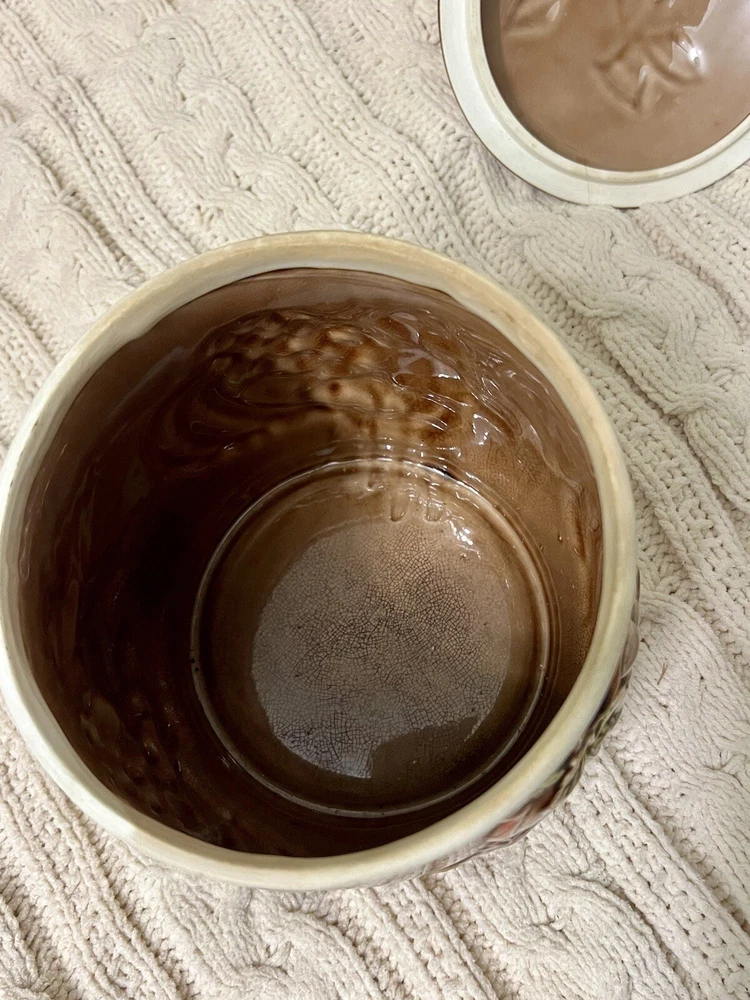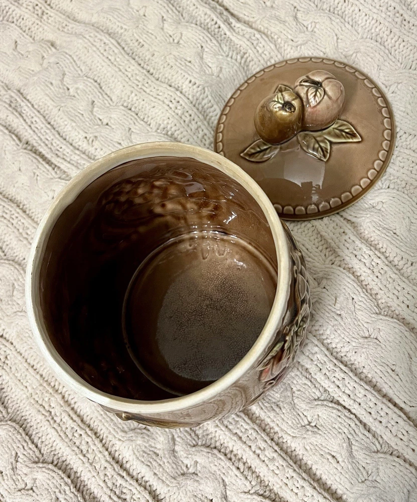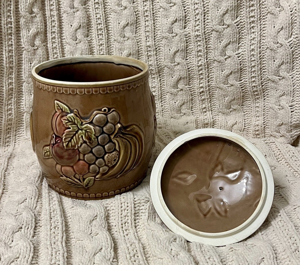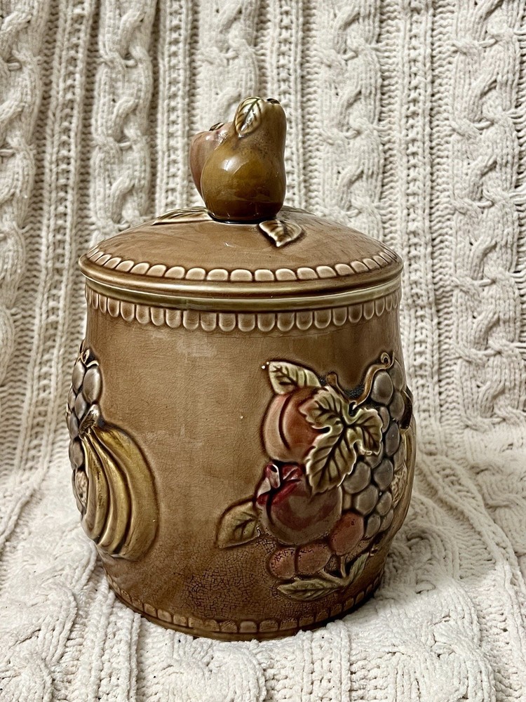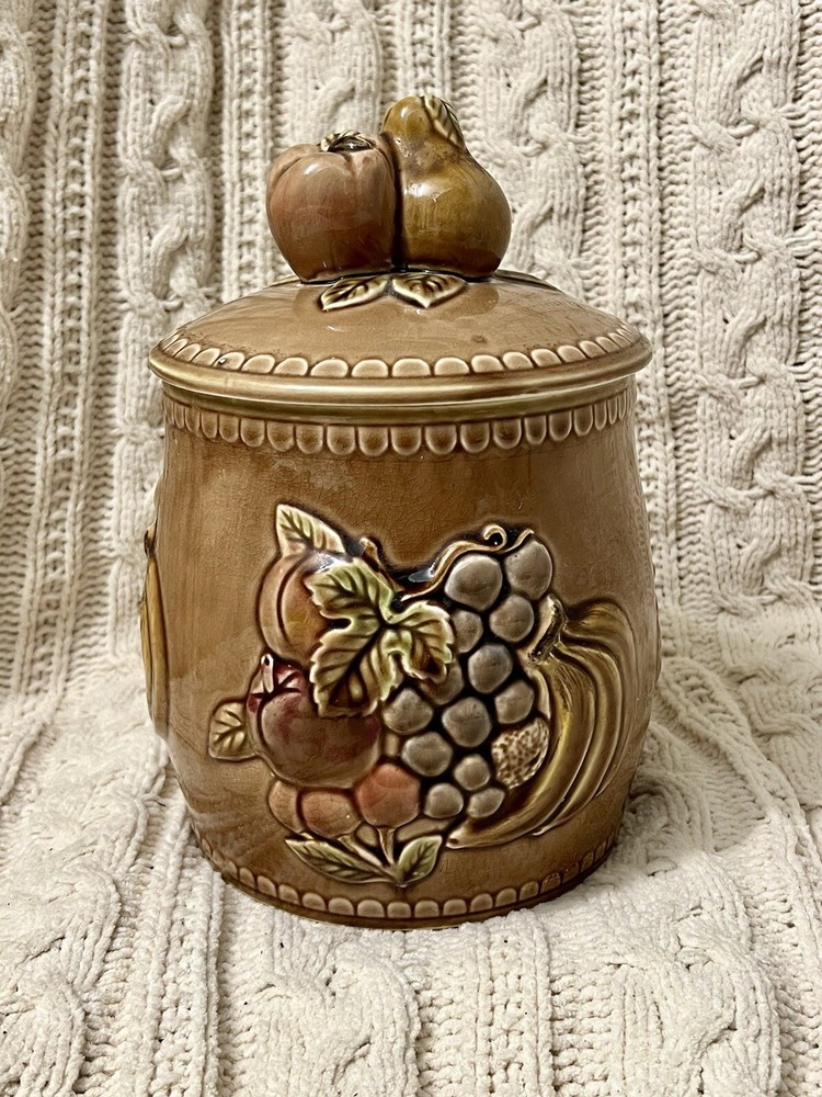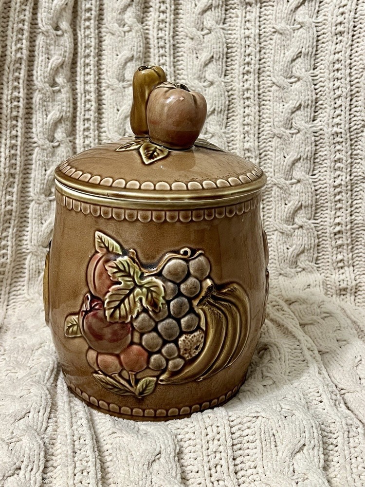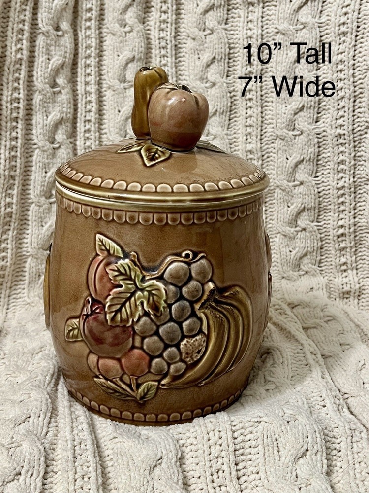 Keep your cookies or any other kitchen items fresh and stylishly stored with this large cookie jar featuring a kitschy fruit design. Made out of high-quality ceramic, this cookie jar is easy to clean and comes with a lid topped with a fruity handle for easy opening and closing. The unique fruit pattern and Japanese style of this extra-large cookie jar make it a rare find for any kitchen. Measuring approximately 10”-10.5" in height and 7" in diameter, this farmhouse-style cookie jar can hold up to two items in the set and has a capacity of one cookie jar with lid. It is perfect for those who love Japanese culture and want to add a touch of it to their kitchen. This cookie jar is a must-have for any kitchen storage and organization needs! **Be sure to check out our other unique items by clicking on our store to see all listings! Free Shipping takes 2-8 business days. We use recycled & repurposed packaging materials as much as possible. Upon purchase your item(s) will be packaged with the utmost care and shipped as quickly as possible using the most efficient & cost effective service eligible. We work hard to ensure you have the best shopping experience by inspecting each item prior to shipment; this may mean opening and re-closing packaging to ensure no breakage or damage has occurred. Please reach out to us directly if there is ever an issue with your order and we will work to reach the best possible solution. PLEASE look closely at all photos. Any flaws or damages to items will be displayed in the images. Items are sold AS IS.