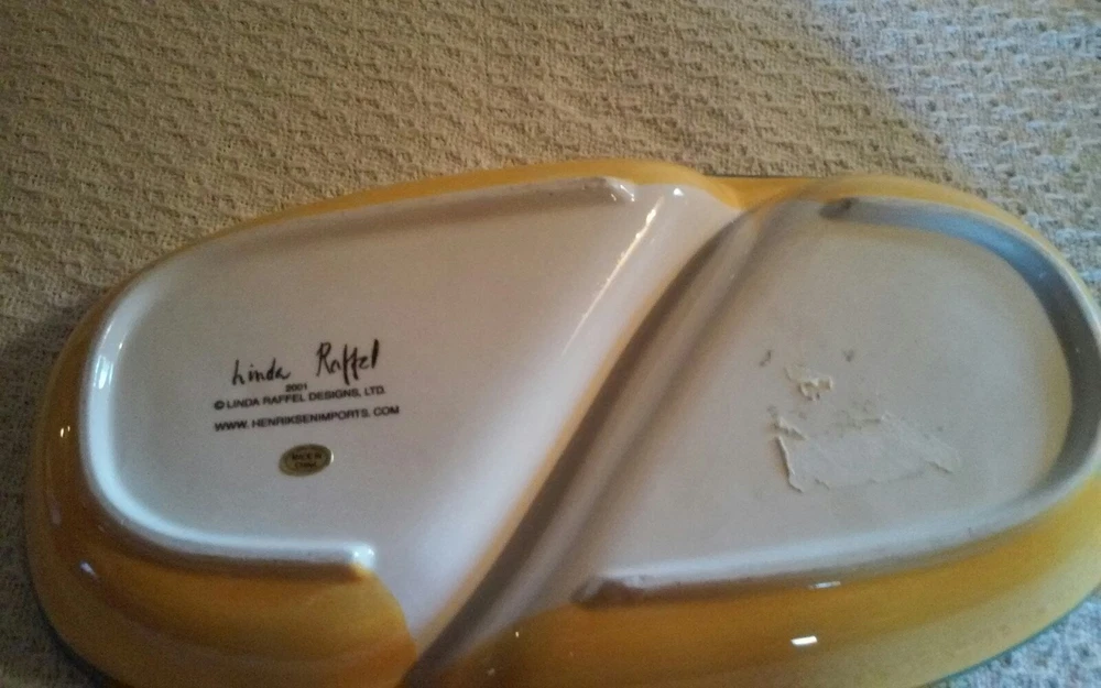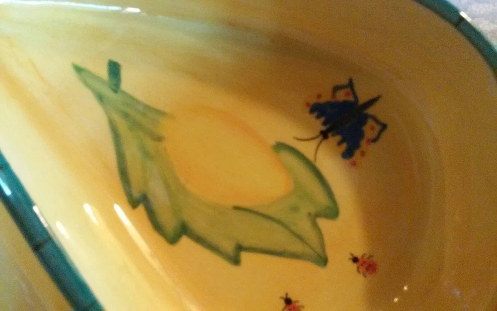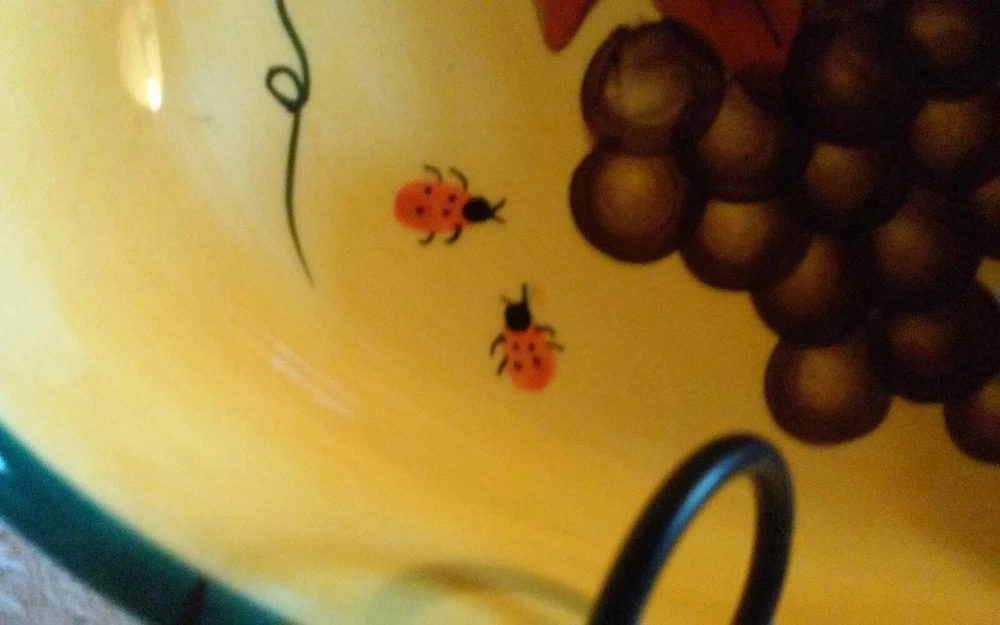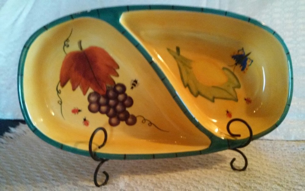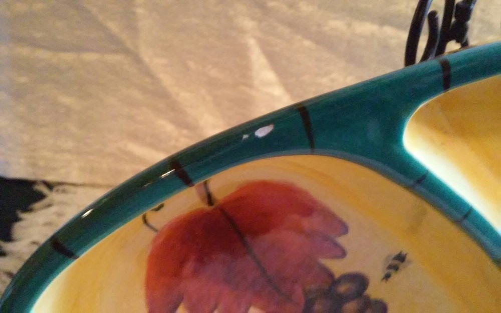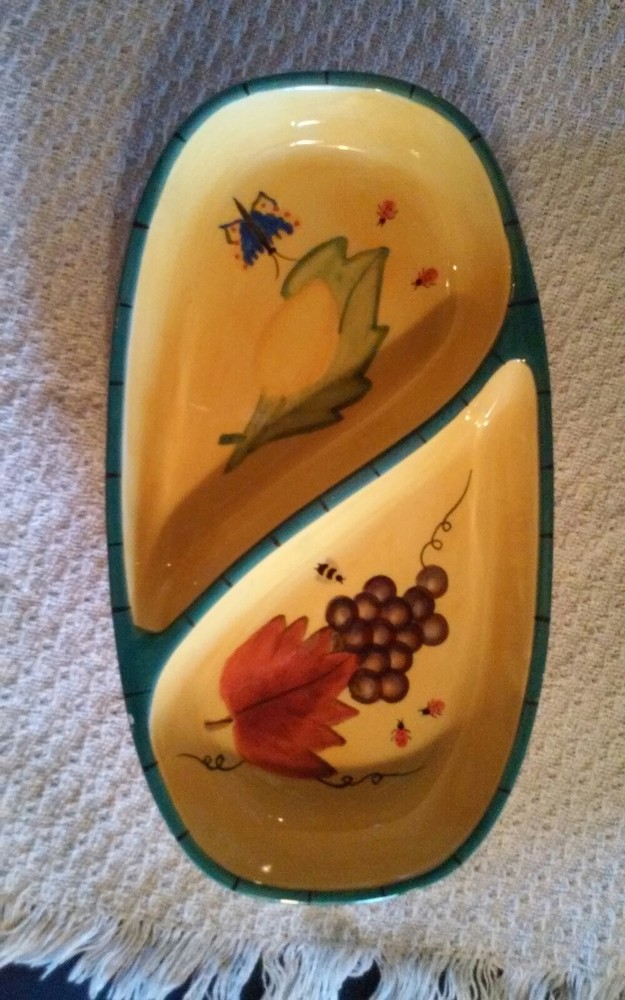 Very good condition. 2001 vintage. This is a extremely rare piece. Very colorful a beauty. With yellow teal green and with grapes ladybugs butterfly lemon and leaves. There are 2 very small chips can be repaired. Size is 11 1/2" x 6 1/4".