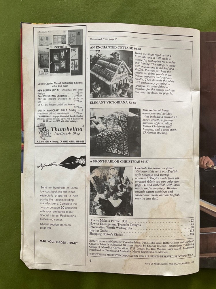 Vintage complete Fall 1985 issue of Better Homes and Gardens Creative Ideas: 100’s of Needlework & Craft Ideas in acceptable condition. Victorian and Christmas themed (see 2nd + 3rd pics for contents); 128 pages; some watermarks, folded edges and slight 1-1.5 inch tears, but complete with patterns and directions. Well packed domestic shipping would be $3.50 via USPS Media Mail, taking 1-8 business days from 26505. Guaranteed next business day shipping. Please message any questions. Check out my other items!