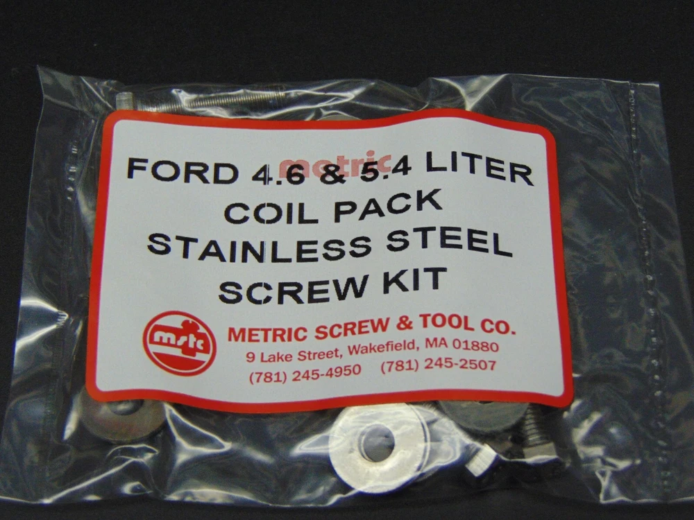 BUY WITH CONFIDENCE! Any Ford hardware kit we sell has been researched AND INSTALLED by a member of our staff. If you have a 4.6 or 5.4 liter Ford engine with individual coil packs (8 coils) then these screws will replace the stock ones that rust and become difficult to remove. You will receive eight stainless steel bolts and flat washers. It is always a good idea to use anti-seize on an application like this, it can be found in any good auto parts store . This is not an OEM part, but it will replace Ford# W711062S437, and our personal experience shows that it is a far superior substitute. NOTE REGARDING AFTERMARKET INTAKES : Some of the less expensive aftermarket intakes did not use OEM style screws, they used a screw similar to a sheetmetal screw. If your coil screws have a very coarse thread like a sheetmetal screw, our kit will not work. We ship all orders within one business day! We have also included options for Priority and Express mail if you are in a hurry. HERE ARE SOME OTHER HELPFUL ITEMS FOR YOUR 4.6, 5.4 AND 6.8 LITER FORD: EXHAUST MANIFOLD STAINLESS STUD OR BOLT KITS......... EXHAUST MANIFOLD THREAD TAP & DRILL........Y-PIPE STAINLESS BOLTS KITS. You can find them on our ebay store under the heading "Ford 4.6, 5.4 and 6.8L Items" .