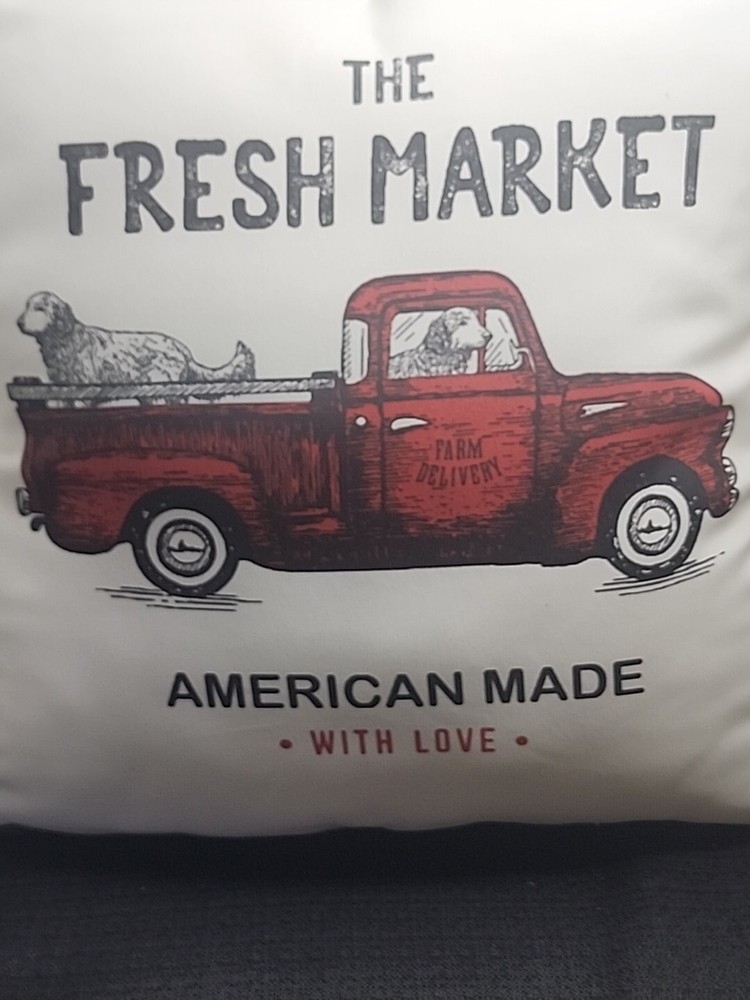 Add a touch of rustic charm to any room with this Farm Delivery Indoor/Outdoor Throw Pillow. Featuring a colorful red truck design with adorable farm dogs, this 16x16 pillow is perfect for offices, porches, RVs, and living rooms alike. Made of fade-resistant fabric and resistant to mildew and stains, this pillow is easy to care for with air dry and surface wash only instructions. Zip closure ensures easy removal for cleaning. Ideal for women and men who love farm life, this Mainstays brand pillow is a great addition to any home decor.