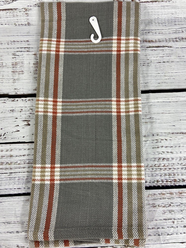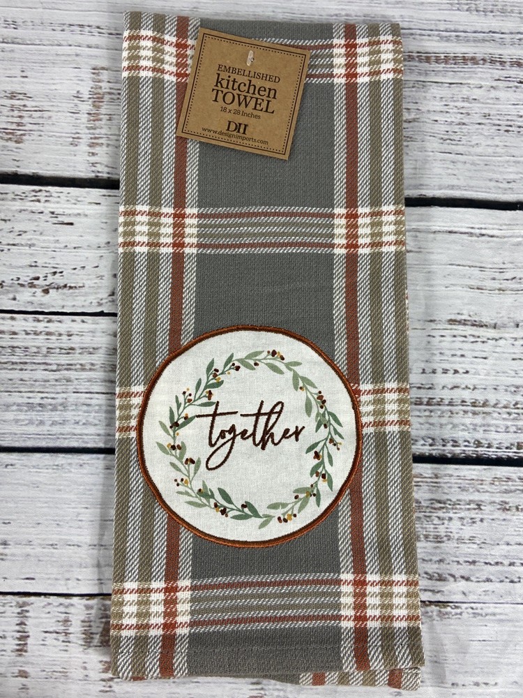 Add warmth to your fall kitchen with this cotton embroidered tea towel. The 18 x 28 inch towel is gray plaid with white, orange, and green. The embroidered design is a circle with a wreath that says “together” stitched in brown. This autumn towel would also make a great gift.