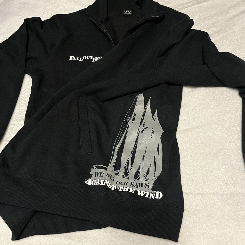 This is a vintage Fall Out Boy jacket from 2005. It has their name printed on the front in small font, and on the side it has a graphic of a sailboat that says "We Set Our Sails Against The Wind". This jacket is in great condition with little to no signs of wear. I am always open to offers Thanks for considering my listing❤️❤️