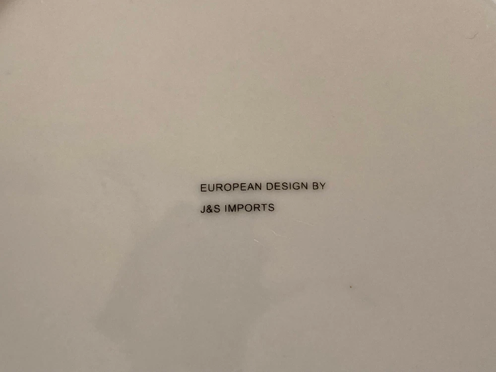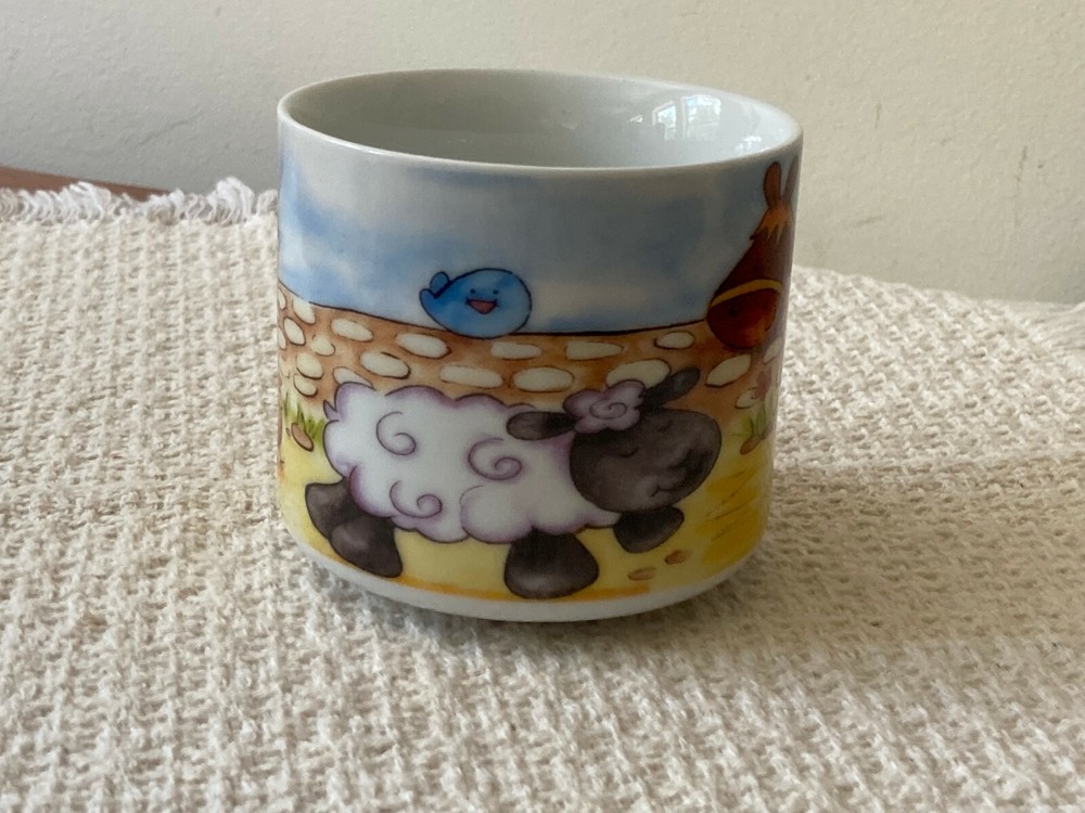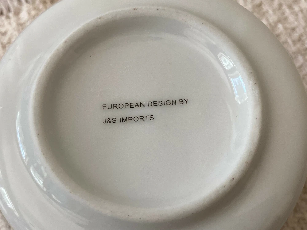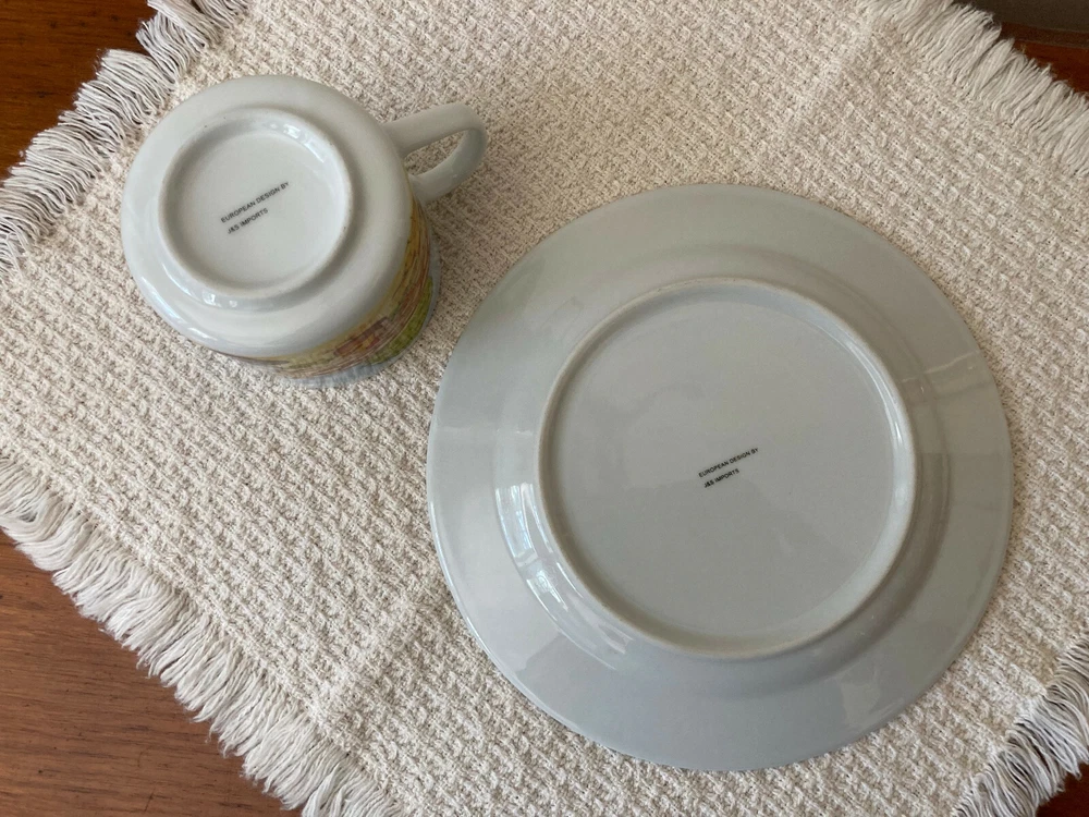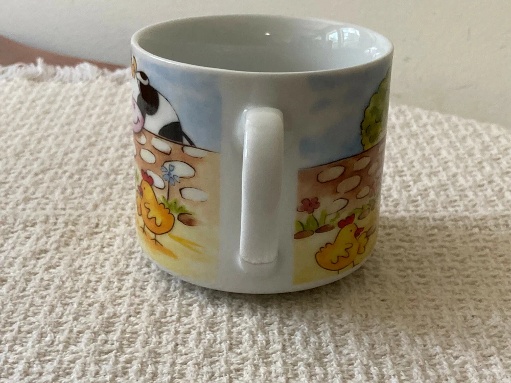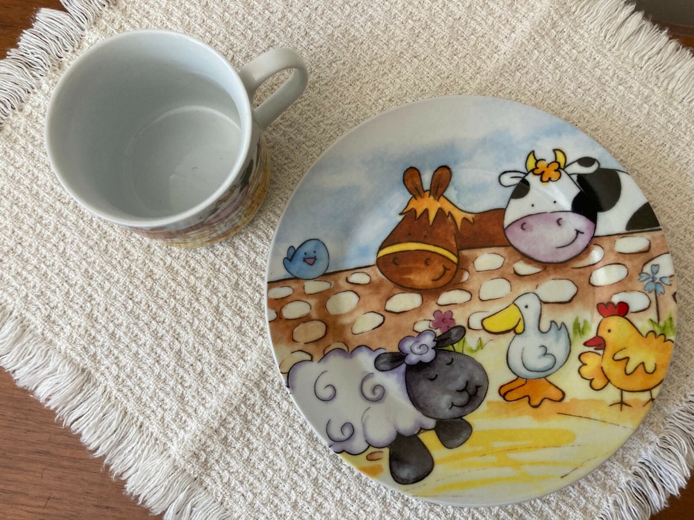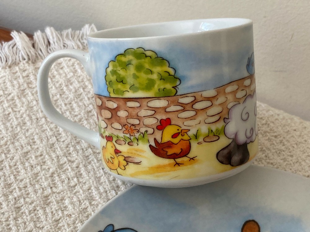 Cheerful Child's Cup and Plate Set covered in farm animals in an all-over design. I especially like the wrap-around design on the cup, with chickens, duck, horse, cow, sheep, and the bluebird of happiness. It is marked on the back "EUROPEAN DESIGN BY J&S IMPORTS" Dimensions are listed above.