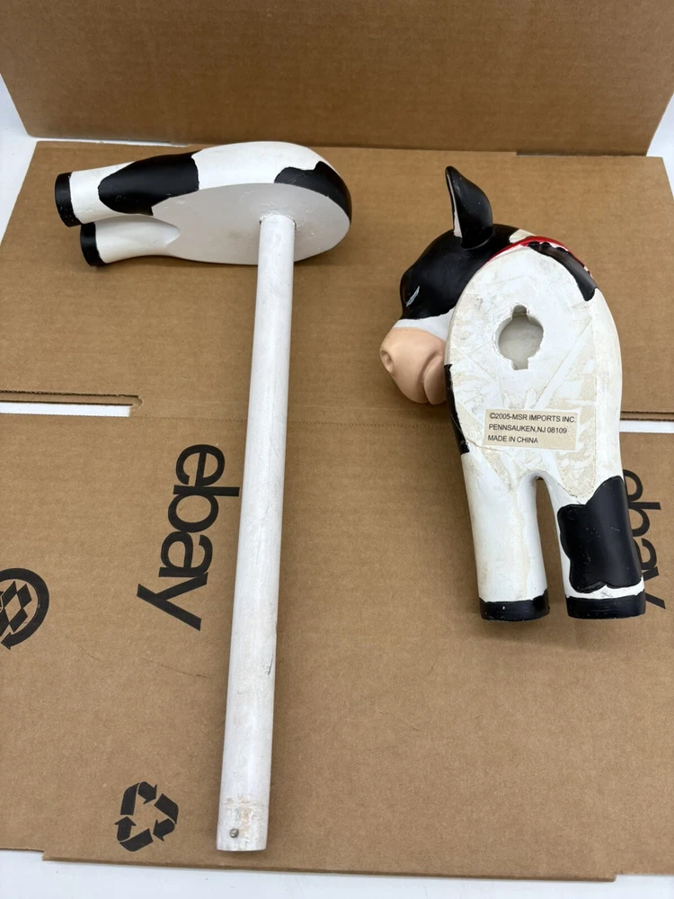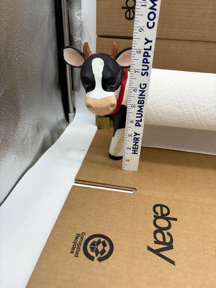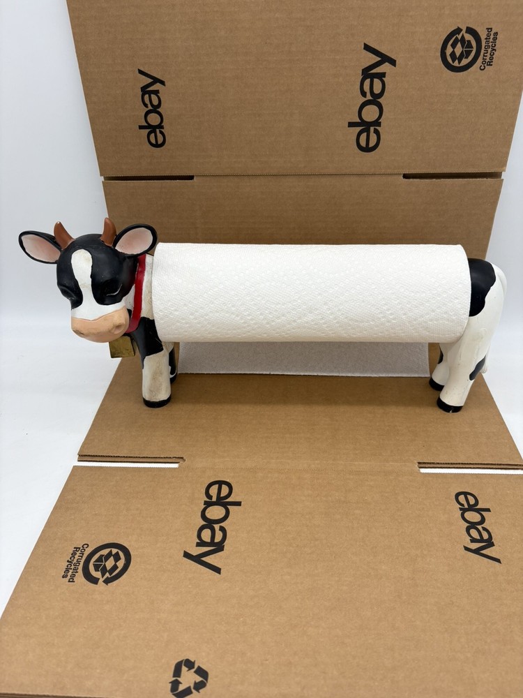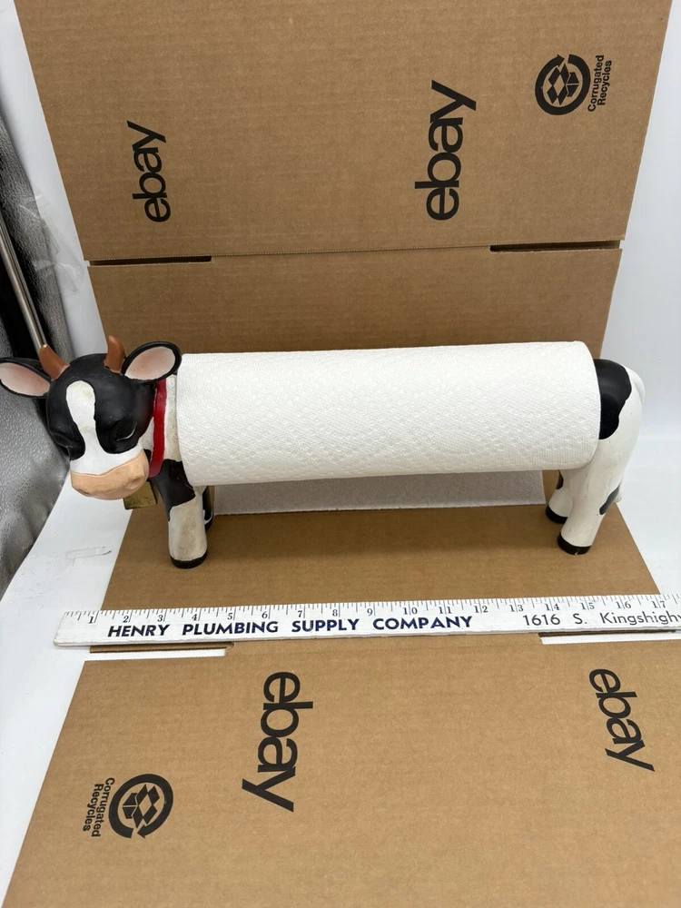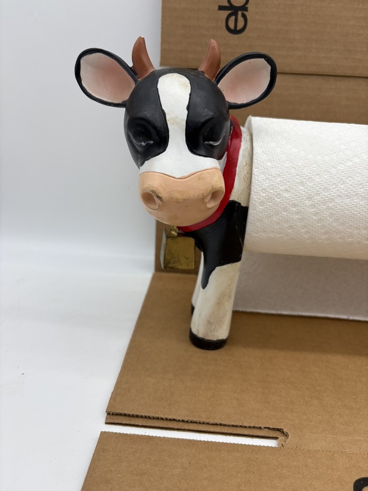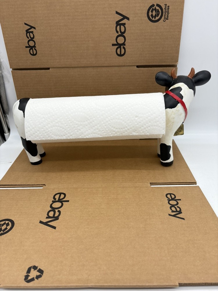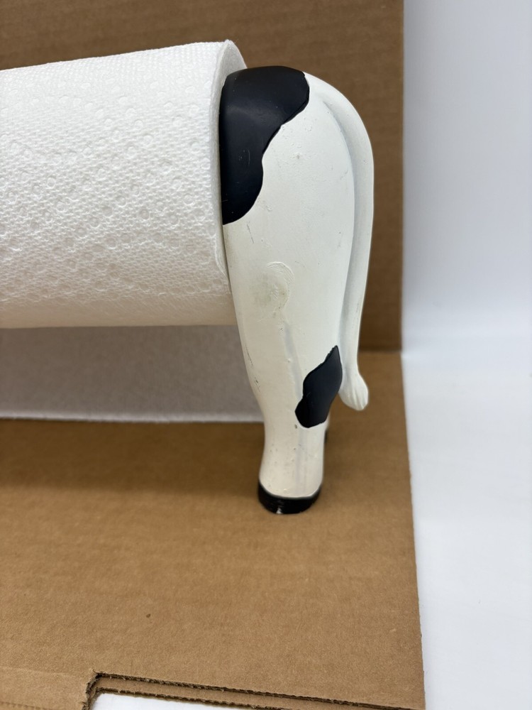 Farmhouse Cow Paper Towel Holder Heavy-Duty Countertop Design White & Black the middle bar is wood but I am not sure if the head and rear are wood or some other material. It is fairly heavy designed for a roll of paper towels. Should hold most rolls but cannot guarantee based on size of roll. Could also use for hand towel or however you choose *paper towels not included* normal wear with scratches and blemishes but no major defects and overall good condition ships fast and free USPS UPS or FedEx! 8