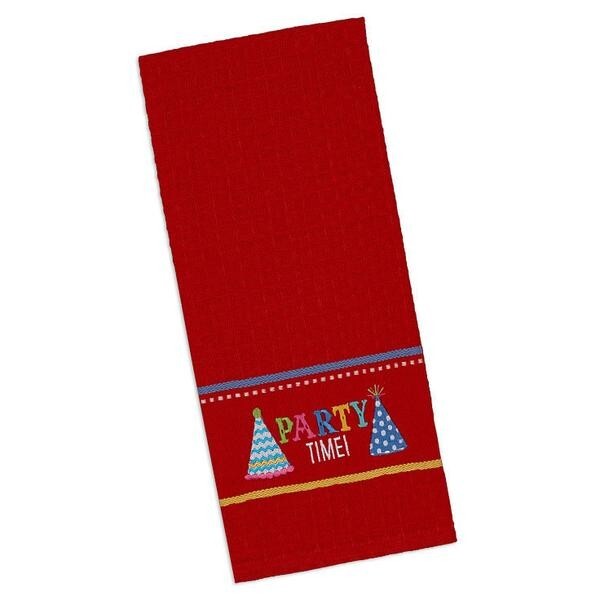 Red "Party Time!" Embroidered Dishtowel Measures 18" x 28" 100% Cotton Machine wash cold separately, gentle cycle, tumble dry low, low iron.