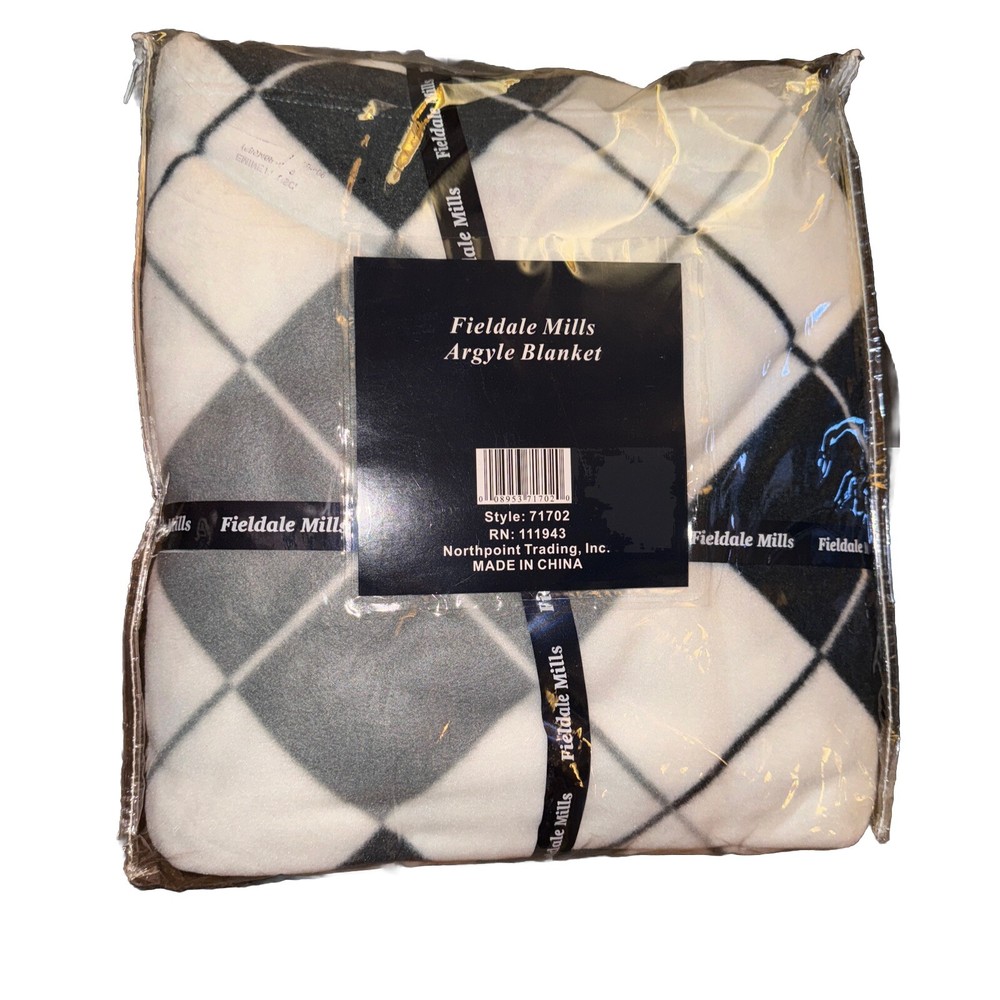 Fieldale Mills Fleece Blanket White/Navy/Gray Twin 90 x 60” Argyle /Diamond Print Pre owned - Never Used - in original plastic carry bag with handle -zip around closure Thank you for visiting B9