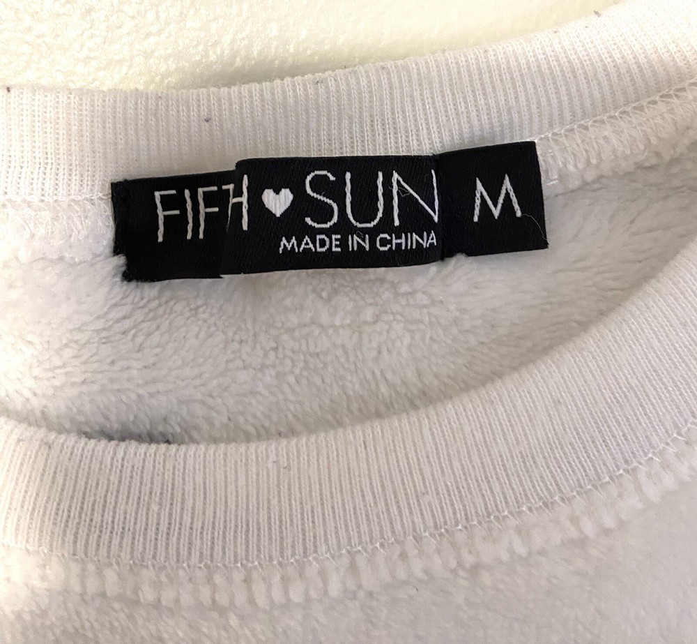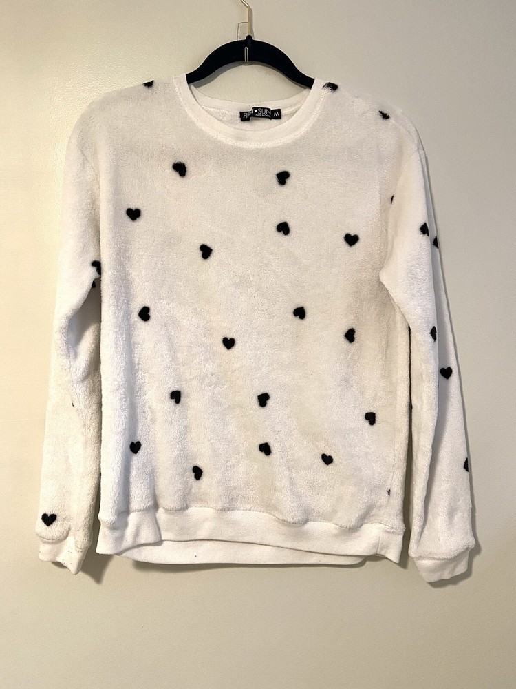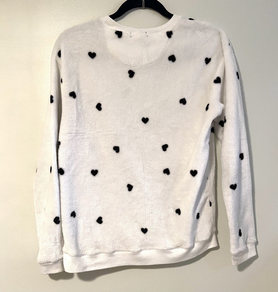 This Fifth Sun long sleeve cozy top is perfect for snuggling up in during the winter and fall seasons. Made of lightweight polyester fleece, it's machine washable and features a lovely white color with black hearts pattern. The pajama top has accents that make it even cozier, and it comes in size M, with a regular fit for women. The Fifth Sun product line is known for high-quality sleepwear, and this lounge/sleep top is no exception. It's great for personal use and is a must-have for any love-themed wardrobe. Get your hands on this amazing top now and enjoy the cozy feeling it brings! thanks for looking (TS22-0)