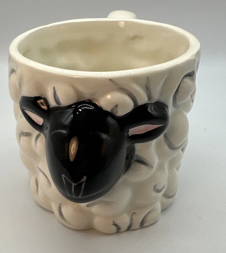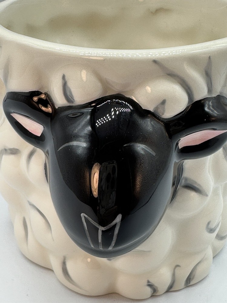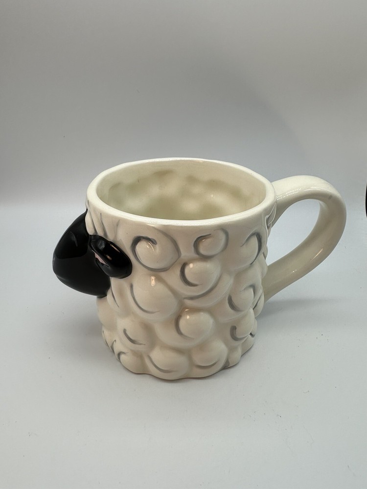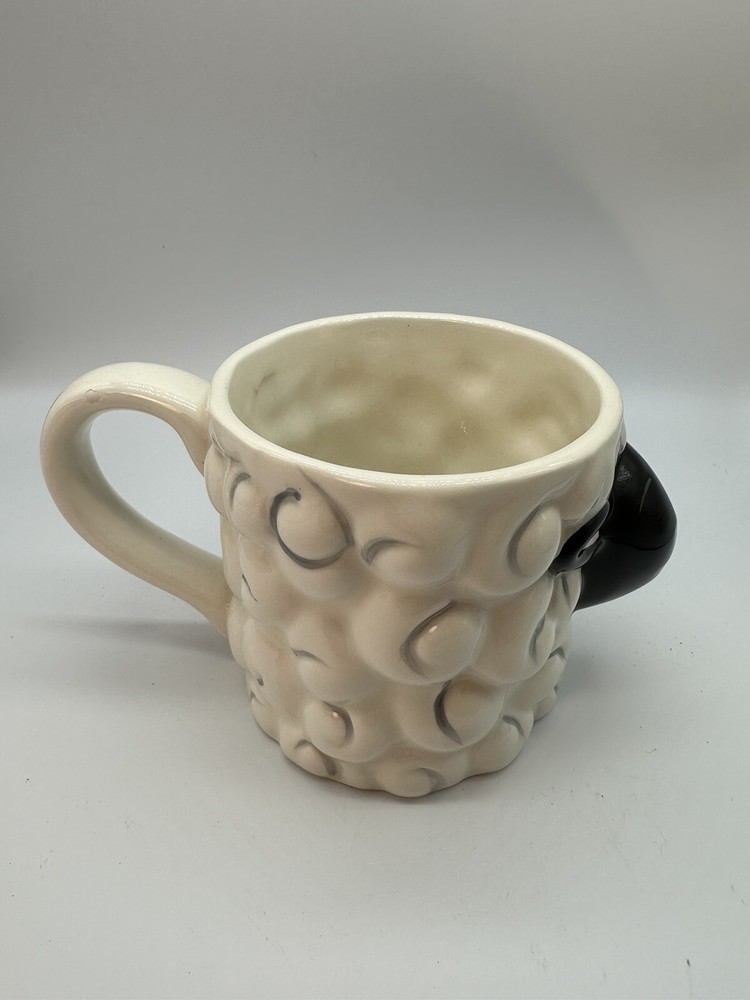 Bring some cute and quirky charm to your coffee or tea drinking routine with this Figural LARGE Pier One 1 Imports SHEEP LAMB 3D Coffee Mug. Perfect for all occasions, this hand-painted ceramic & porcelain mug features an animal print pattern and an art glass finish. The mug is perfect for hot beverages and includes a cup to keep your drink warm. This original Pier 1 design is a perfect gift for yourself or any teens, boys, or girls in your life who love unique and fun kitchenware.