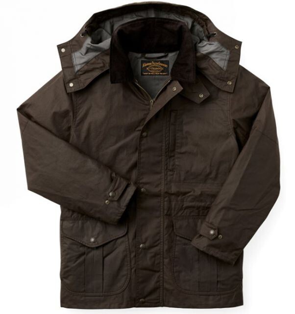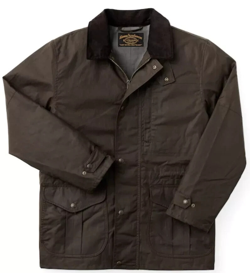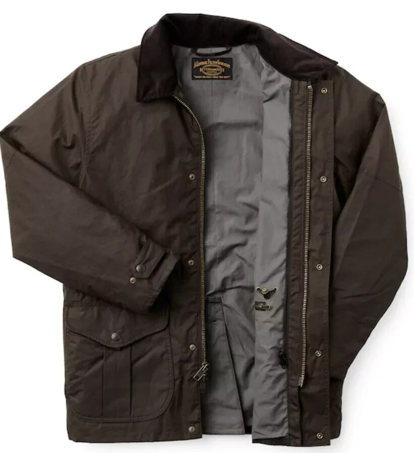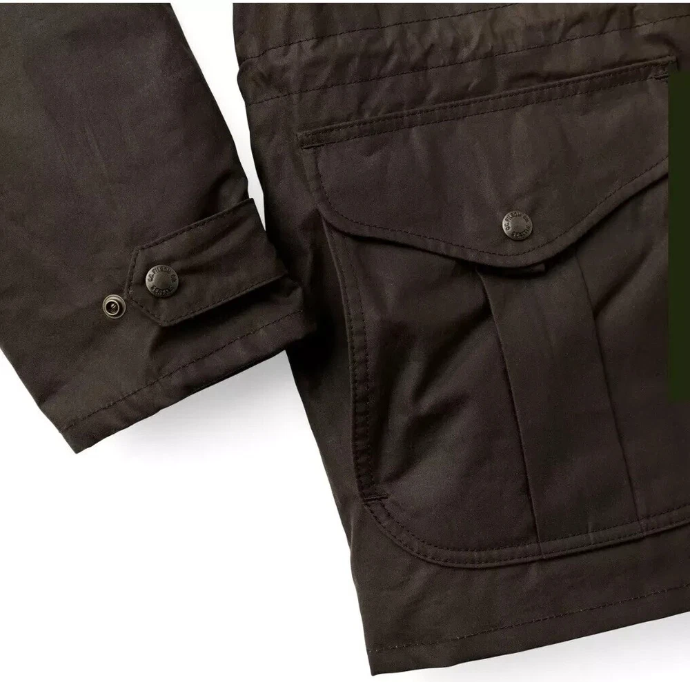 Item: Filson Cover Cloth Woodland Jacket Size: XL Condition: NEW / Factory Second Color: Cabin Product #: 20235879 Note: Pristine! Info: The Cover Cloth Woodland Jacket is an update to our classic, decades-proven Mile Maker Coat. The 8-oz. oil finish Cover Cloth shell blocks wind and water. It’s fully lined with dry finish Cover Cloth in the torso and easy-layering polyester twill in the sleeves. The front secures with a two-way metal zipper for versatile ventilating options, and the hem and cuffs are adjustable for a custom fit. The high-capacity cargo pockets hide flannel-lined handwarmer pockets. Double-layer forearm reinforcements add durability. It’s compatible with Filson zip-in liners and includes a detachable hood. Features: Waxed cotton shell is fully lined with dry finish cotton and polyester twill Fingertip length for added coverage Flapped cargo/handwarmer pockets and zippered chest pocket Reinforced forearms and corduroy-lined collar Two-way zip-front closure with storm guard Includes detachable hood Made in Sri Lanka Material: 8-oz. 100% cotton oil finish Cover Cloth + 6-oz. 100% cotton dry finish Cover Cloth + 8-oz. 100% cotton flannel – 100% cotton corduroy + polyester twill