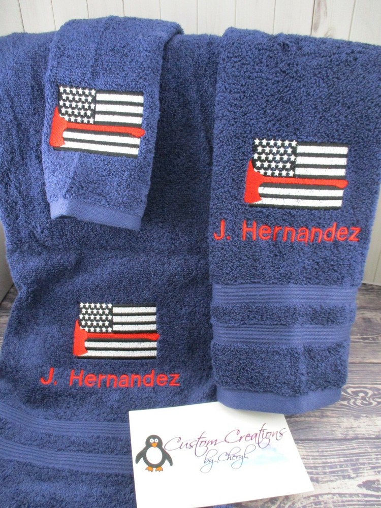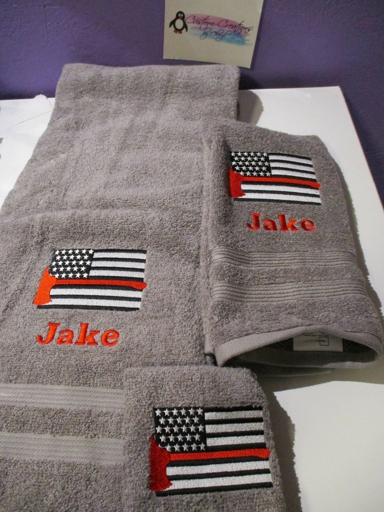 Up for sale on this auction is a really nice PERSONALIZED 3 piece towel set: bath (50 x 26) hand (25 x 16) towel and washcloth combo set. This set is a gray set but I can do any towel, washcloth and or hand towel color that you would like just leave the info in the comment box when you checkout. I have green, purple, orange, turquoise, tan, chocolate, hot pink, black, gray, white, navy blue, burgundy, red, & royal blue. This design is Red Thin Line Flag Ax with a thin red line going through it and the name of YOUR choice the washcloth is the design ONLY!!! I do have many thread colors to choose from. All of my items are custom made and do come from a smoke free home. I will be more then happy to combine shipping charges. If you do not see a design that you are interested in please ask as I am sure I will have it. Designs range from sports, mascots, kids themes, weddings, teens, and many more.... Please leave the info in the comment box when you checkout. PLEASE LEAVE THE TOWEL COLOR AND NAME THAT YOU WOULD LIKE ON THIS SET IN THE MESSAGE COMMENT BOX... IF NONE IS GIVEN THEN I WILL USE JUST THE LOGO AND THE TOWEL COLOR LISTED IN THE MAIN PICTURE !!! THANKS FOR LOOKING!!!