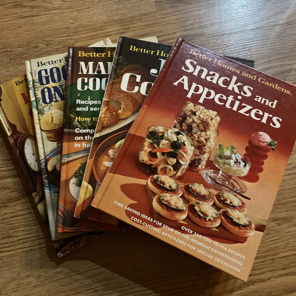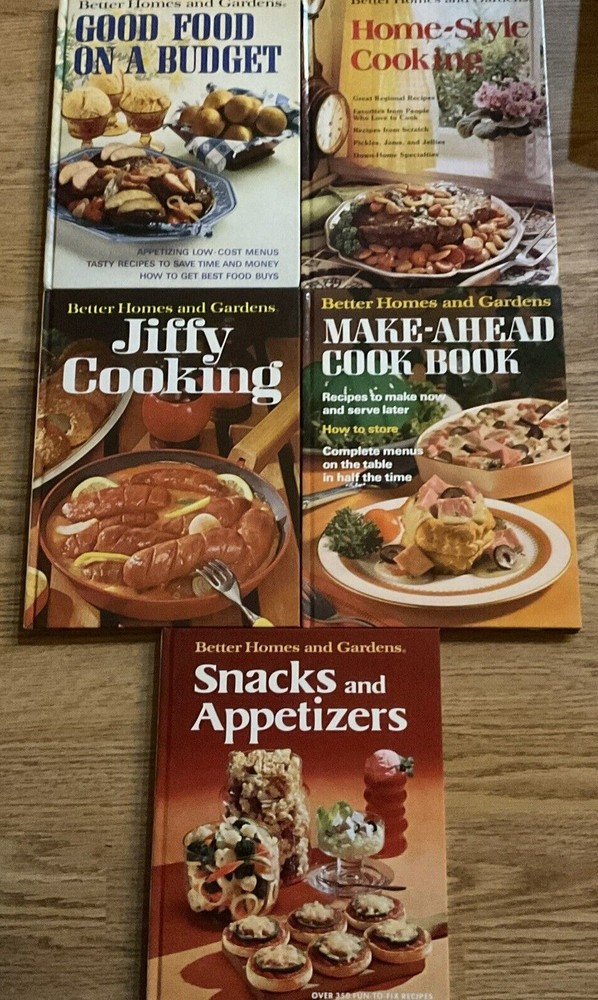 Five Vintage Better Homes & Gardens Meredith Corporaton Cook Books. Includes: Snacks and Appetizers, copyright 1974, first edition, first printing Jiffy Cooking, copyright 1967, first edition, ninth printing, 1973 Make-Ahead Cook Book, copyright 1971, first edition, third printing, 1973 Good Food on a Budget, copyright 1971, first edition, first printing Home-Style Cooking, copyright 1975, first edition, first printing See pictures as they are part of the description. I ship worldwide and combine shipping. Visit my store for more vintage items and crafts.