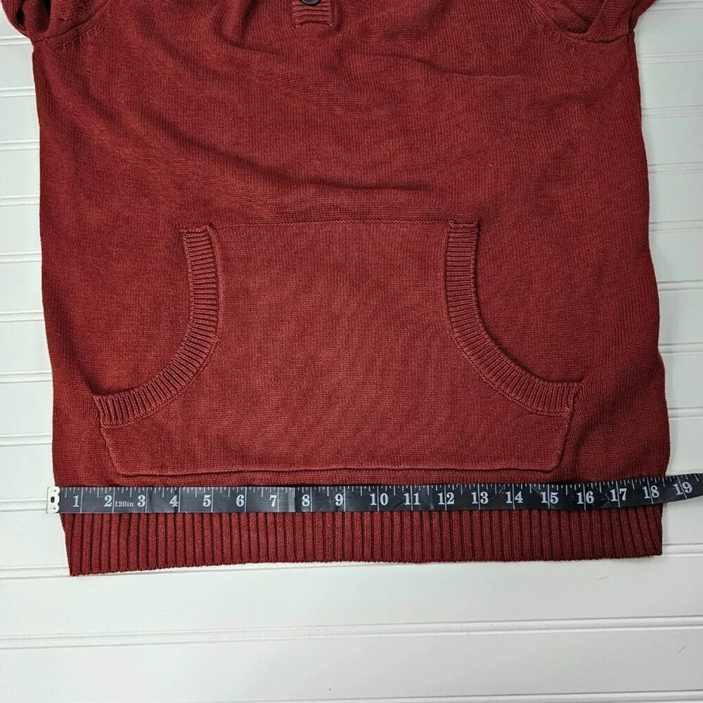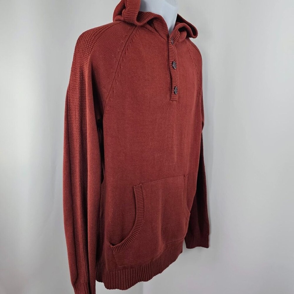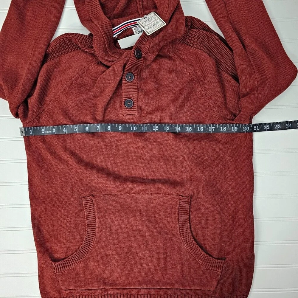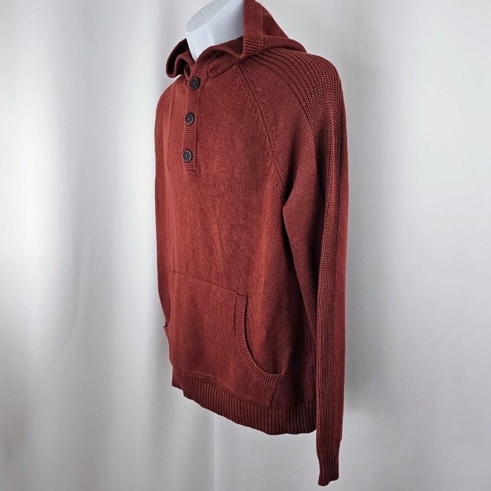 Flag & Anthem's Men's Rust Red Hooded Knit Sweater. Combining comfort and style, this sweater features a warm hood, convenient pouch pocket, and a classic rust red color for a sophisticated look. Perfect for any occasion, whether lounging at home or out on the town. - NWT - 3 button henley style neckline - Warm hood for added coziness - Convenient pouch pocket for storage - Classic rust red color - Raglan sleeves with contrast knit accent - Ribbed cuffs and hem - Versatile for all occasions - Slim fit - 100% Cotton - Approximate lay flat measurements: PTP 20.5" Waist 18.5" Length 26.5" Sleeve 27.5" - Men's sweater size Medium Smoke free location Same or next day shipping Offers welcome #MensSweater #RustRed #OutdoorStyle #FlagAndAnthem